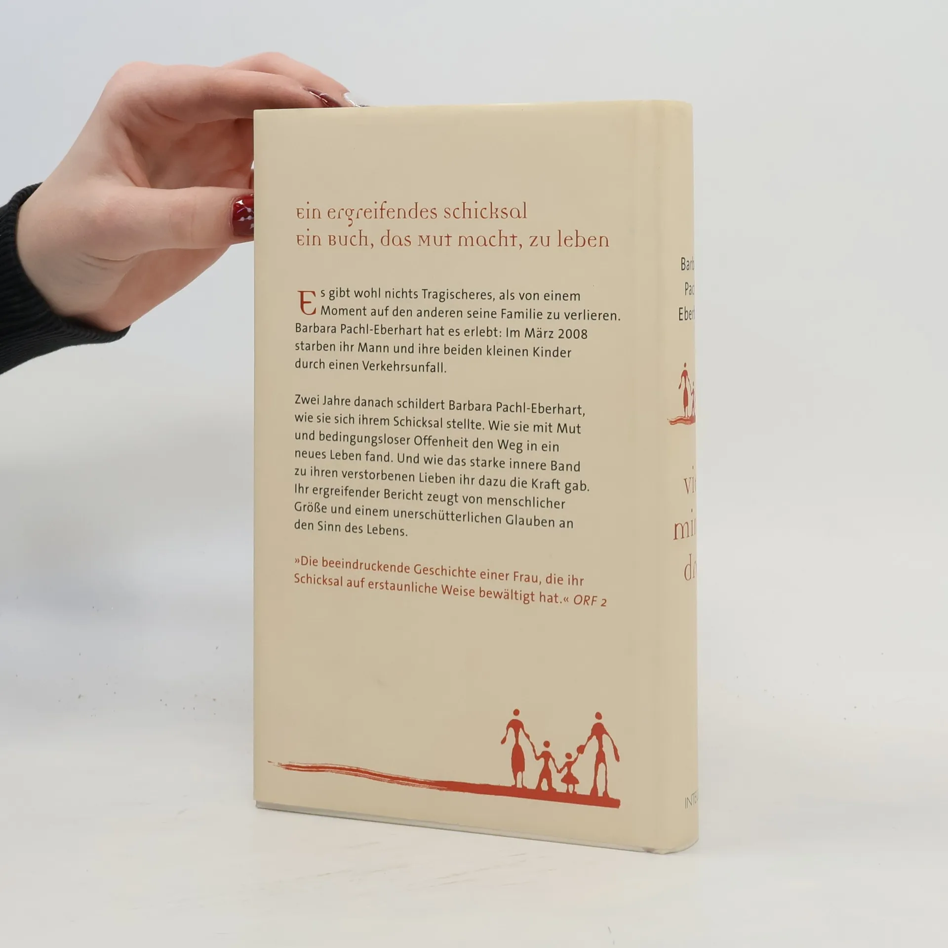 Ein Schicksal, das erschüttert – und dennoch Mut macht, zu leben Wie schafft es eine Frau, die ihren Mann und ihre beiden kleinen Kinder durch einen Verkehrsunfall verliert, überhaupt weiterzuleben? Fünf Tage nach dem schrecklichen Ereignis schreibt Barbara Pachl-Eberhart einen offenen Brief an ihre Verwandten und Freunde, der in beeindruckender Intensität ihre Gefühle darlegt. Rasch findet das erschütternde Dokument durch Internet, Zeitungen und Zeitschriften eine große Verbreitung. Die Tragödie dieser Familie bewegt Tausende Menschen. Zwei Jahre nach dem tragischen Ereignis schildert Barbara Pachl-Eberhart nun ihren Weg in ein neues Leben. Die Offenheit, mit der sie sich ihrem Schicksal stellt, und der Mut, mit dem sie Schritt für Schritt in eine unbekannte Zukunft geht, zeugen auf ergreifende Weise von menschlicher Größe und einem unerschütterlichen Glauben an den Sinn des Lebens. Die Autorin wurde 2009 mit dem wichtigsten österreichischen Frauenpreis, dem „Leading Ladies Award“, ausgezeichnet.
