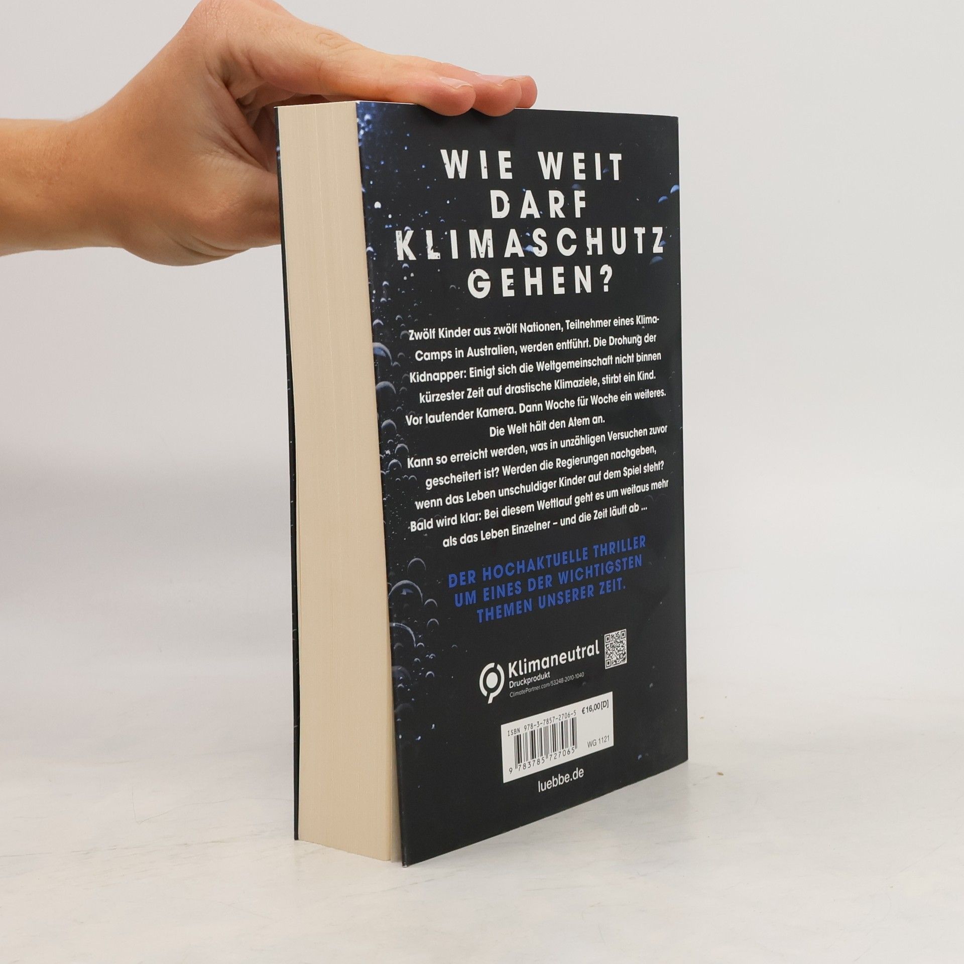 Der hochaktuelle Thriller um eines der wichtigsten Themen unserer Zeit: Zwölf Kinder aus zwölf Nationen, Teilnehmer eines Klima-Camps in Australien, werden entführt. Die Drohung der Kidnapper: Einigt sich die Weltgemeinschaft nicht binnen kürzester Zeit auf drastische Klimaziele, stirbt ein Kind. Vor laufender Kamera. Dann Woche für Woche ein weiteres. Die Welt hält den Atem an. Kann so erreicht werden, was in unzähligen Versuchen zuvor gescheitert ist? Werden die Regierungen nachgeben, wenn das Leben unschuldiger Kinder auf dem Spiel steht? Bald wird klar: Bei diesem Wettlauf geht es um weitaus mehr als das Leben Einzelner - und die Zeit läuft ab ...