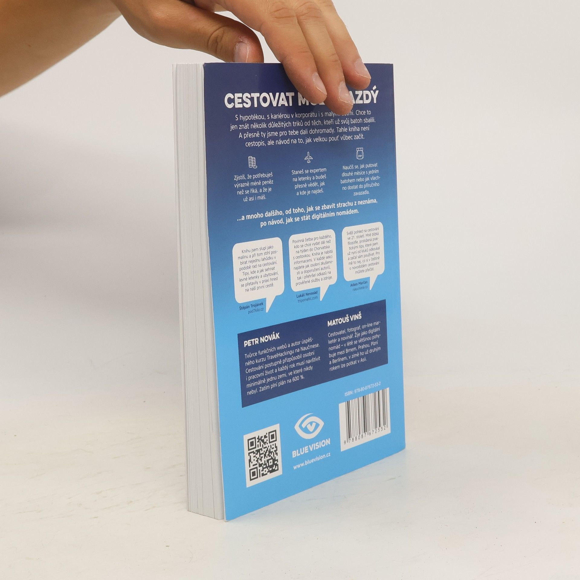 Cestovat může každý. S hypotékou, s kariérou v korporátu i s malými dětmi. Chce to jen znát pár důležitých triků od těch, kteří už svůj batoh sbalili. A přesně ty dali cestovatelé Matouš Vinš a Petr Novák v knize dohromady. Zdaleka přitom nečerpali jen z vlastních zkušeností, oslovili i mnoho ostřílených kolegů dobrodruhů a světoběžníků. Travel Bible je návod na to, jak velkou pouť vůbec začít a jak si ji naplno užít. Po jejím přečtení přestanete jen snít a skutečně vyrazíte do zemí, kam už se tak dlouho toužíte podívat. Zažijete věci, na které do konce života nezapomenete, a poznáte místa, která neuvidíte ani v National Geographic. V knize zjistíte, jak si na cestu našetřit, jak sehnat levné letenky a jak neutratit zbytečně mnoho za ubytování. Cestovat se dá i chytře, zdaleka není potřeba šetřit za každou cenu. Uvědomíte si, že nejlepší způsob je co nejvíce splynout s místními obyvateli a přestat se chovat jako turista. V druhé části knihy vám autoři přiblíží možnosti dobrovolničení a práce na cestách, přidají své zkušenosti s digitálním nomádstvím a pomůžou vám se osvobodit z klasických pracovních stereotypů. Závěr knihy věnují možnostem, jak si díky zážitkům, fotkám a videím z cest vydělat na objevování dalších zemí.
