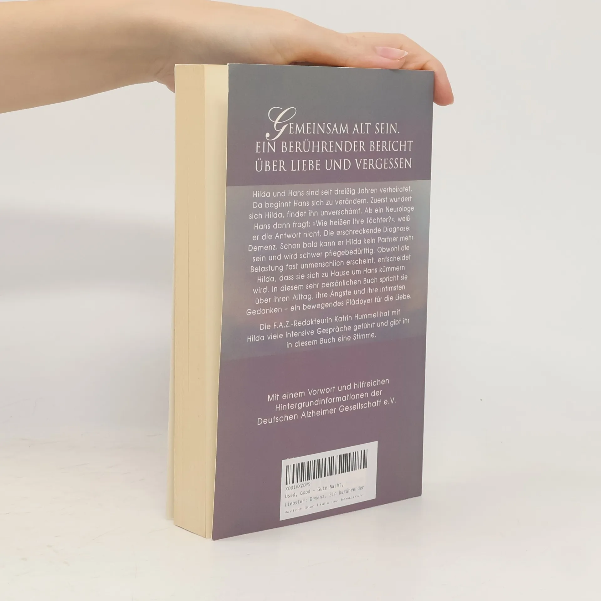 Hilda und Hans sind seit dreißig Jahren verheiratet. Doch langsam beginnt Hans sich zu verändern. Zuerst wundert sich Hilda über ihn, findet sein Verhalten manchmal unverschämt. Als ein Neurologe ihn dann fragt: „Wie heißen ihre Töchter?“, weiß Hans die Antwort nicht. Die erschreckende Diagnose: Demenz. Schon bald kann er seiner Frau Hilda kein Partner mehr sein und wird zum Schwerstpflegefall. Obwohl die Belastung fast unmenschlich erscheint, entscheidet Hilda, dass sie sich zu Hause um ihren Mann kümmern wird. In diesem sehr persönlichen Buch spricht sie über ihren Alltag, ihre Ängste und ihre intimsten Gedanken. Ihr Bericht ist ein bewegendes Plädoyer für die Liebe.
