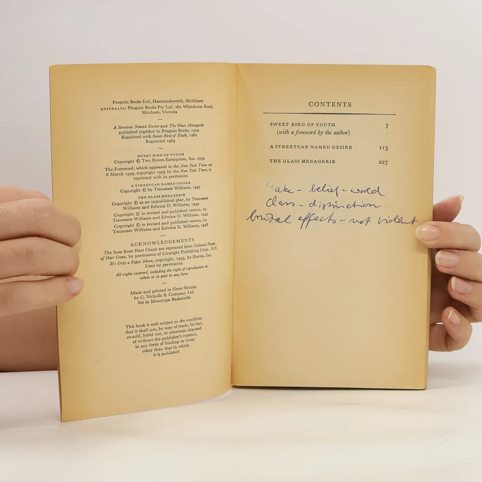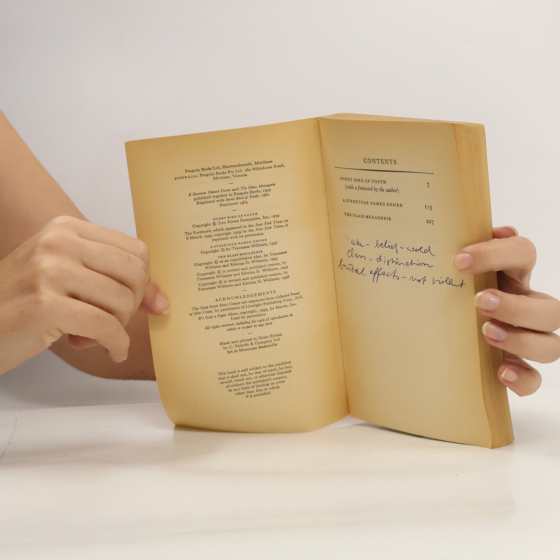 Writing in 1959, at about the time Elia Kazan directed Sweet Bird of Youth on Broadway, Tennessee Williams described his first successful play as being "about as violent as you can get on the stage. During the 19 years since then I have only produced five plays that are not violent". First among them The Glass Menagerie, the memory play which was first presented in London in 1948 and in which he employed every device of scenery, lighting, and music to evoke nostalgia. The following year, he scored one of his biggest successes with A Streetcar named Desire, in which a woman's pathetic fantasies of primness and respectability are stripped down and violently exposed in New Orleans. --back cover