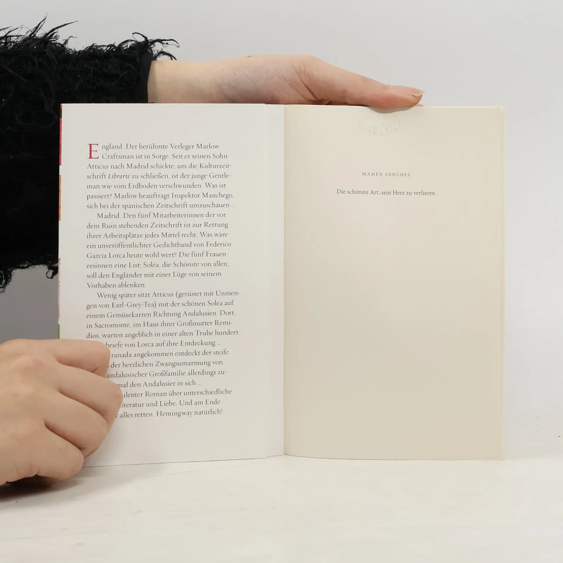 England. Der berühmte Verleger Marlow Craftsman ist in Sorge. Seit er seinen Sohn Atticus nach Madrid schickte, um die Kulturzeitschrift Librarte zu schließen, ist der junge Gentleman wie vom Erdboden verschwunden. Was ist passiert? Marlow beauftragt Inspektor Manchego, sich bei der spanischen Zeitschrift umzuschauen … Madrid. Den fünf Mitarbeiterinnen einer vor dem Ruin stehenden Literaturzeitschrift ist zur Rettung ihrer Arbeitsplätze jedes Mittel recht. Was wäre ein unveröffentlichter Gedichtband von Federico García Lorca heute wohl wert? Die fünf Frauen ersinnen eine List: Soléa, die Schönste von allen, soll den Engländer mit einer Lüge von seinem Vorhaben ablenken. Wenig später sitzt Atticus (gerüstet mit Unmengen von EarlGrey Tea) mit der schönen Soléa auf einem Gemüsekarren Richtung Andalusien. Dort, in Sacromonte, im Haus ihrer Großmutter Remidios, warten angeblich in einer alten Truhe hundert Liebesbriefe von Lorca auf ihre Entdeckung … In Granada angekommen entdeckt der steife Brite in der herzlichen Zwangsumarmung von Soléas andalusischer Großfamilie allerdings zunächst einmal ein unbekanntes Gefühl in sich …