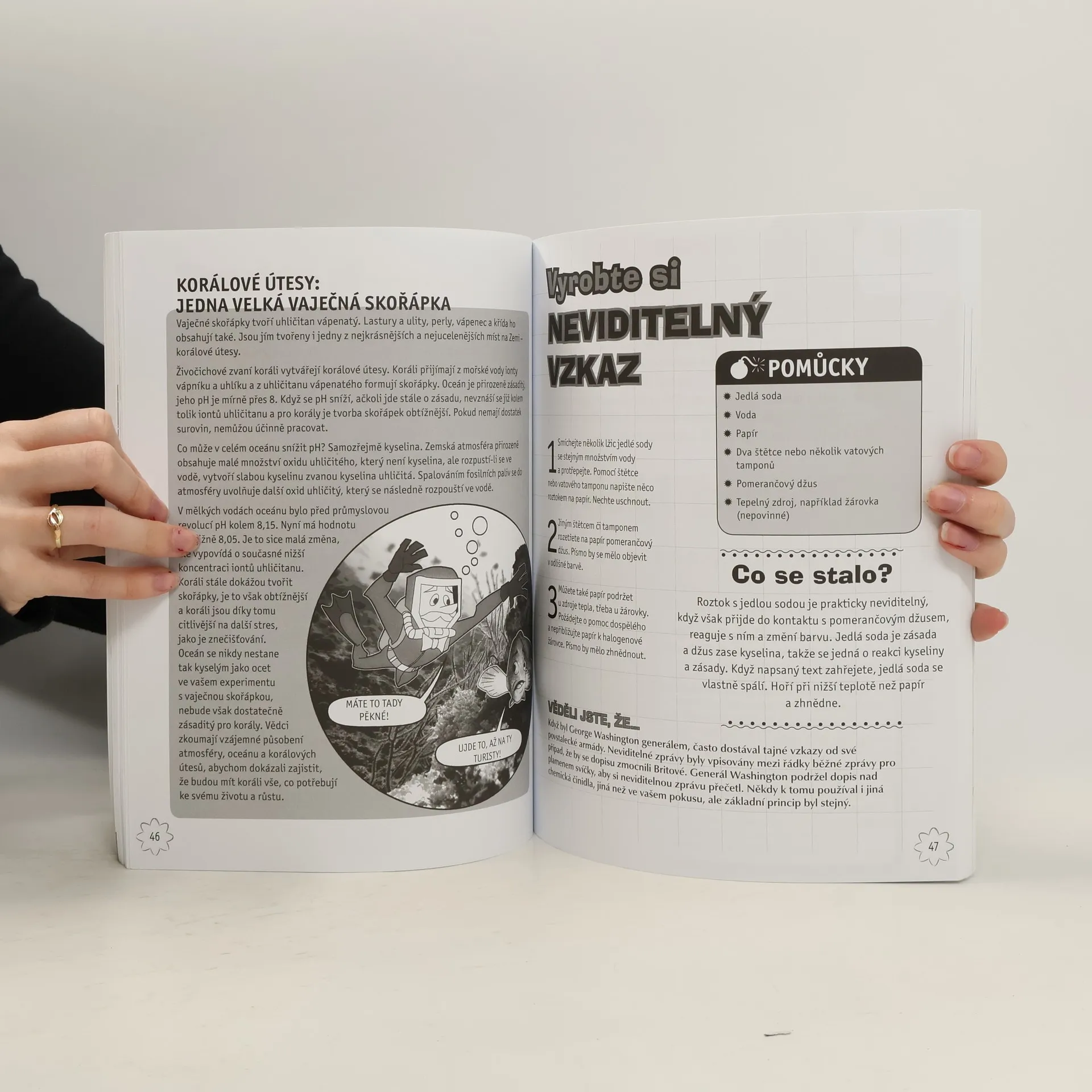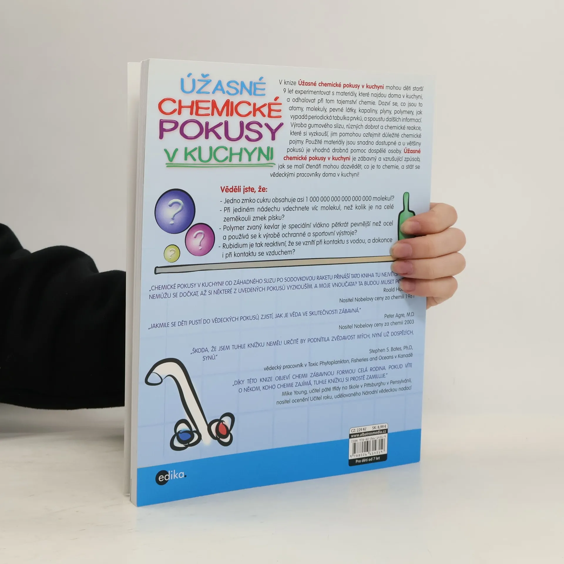 Návody z knihy Úžasné chemické pokusy v kuchyni děti starší 9 let využijí k experimentování s materiály, které najdou doma v kuchyni, a současně při tom odhalí řadu tajemství chemie. Dozví se, co jsou to atomy, molekuly, pevné látky, kapaliny, plyny, polymery, jak vypadá periodická tabulka prvků a spoustu dalších informací. Výroba gumového slizu, různých dobrot a chemické reakce, které si vyzkouší, jim pomohou ozřejmit důležité chemické pojmy.