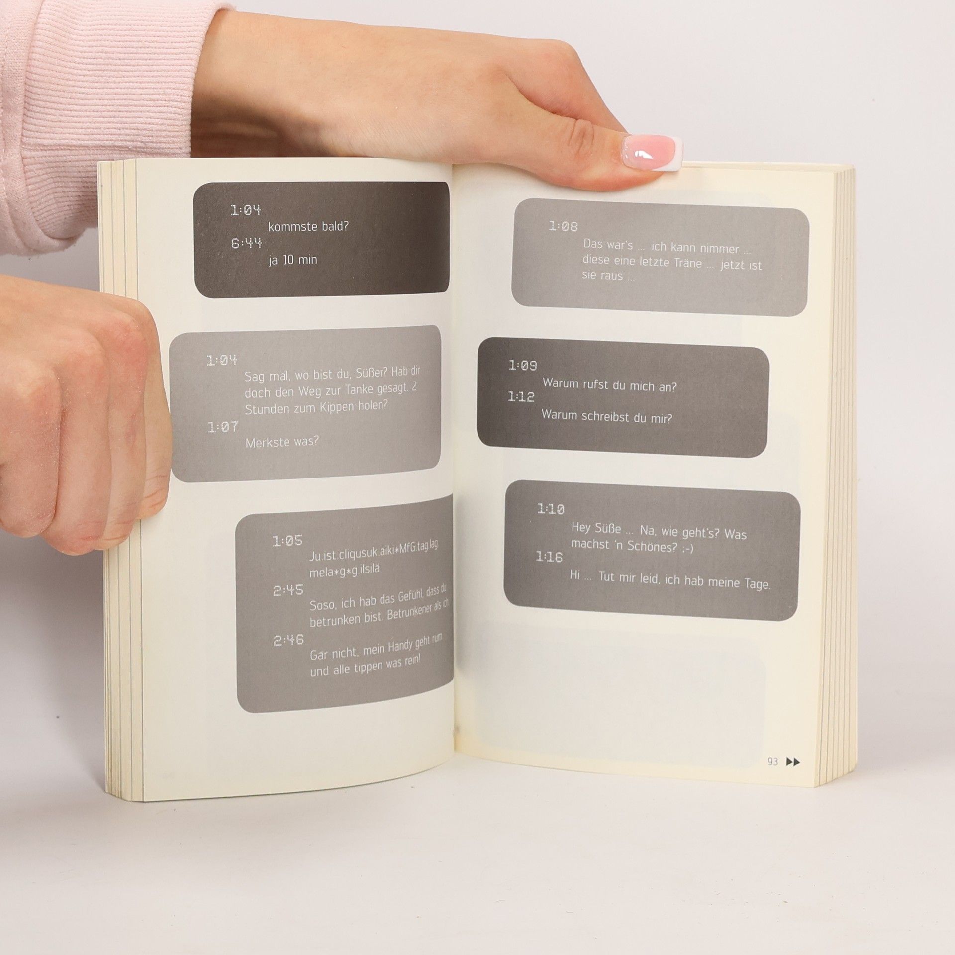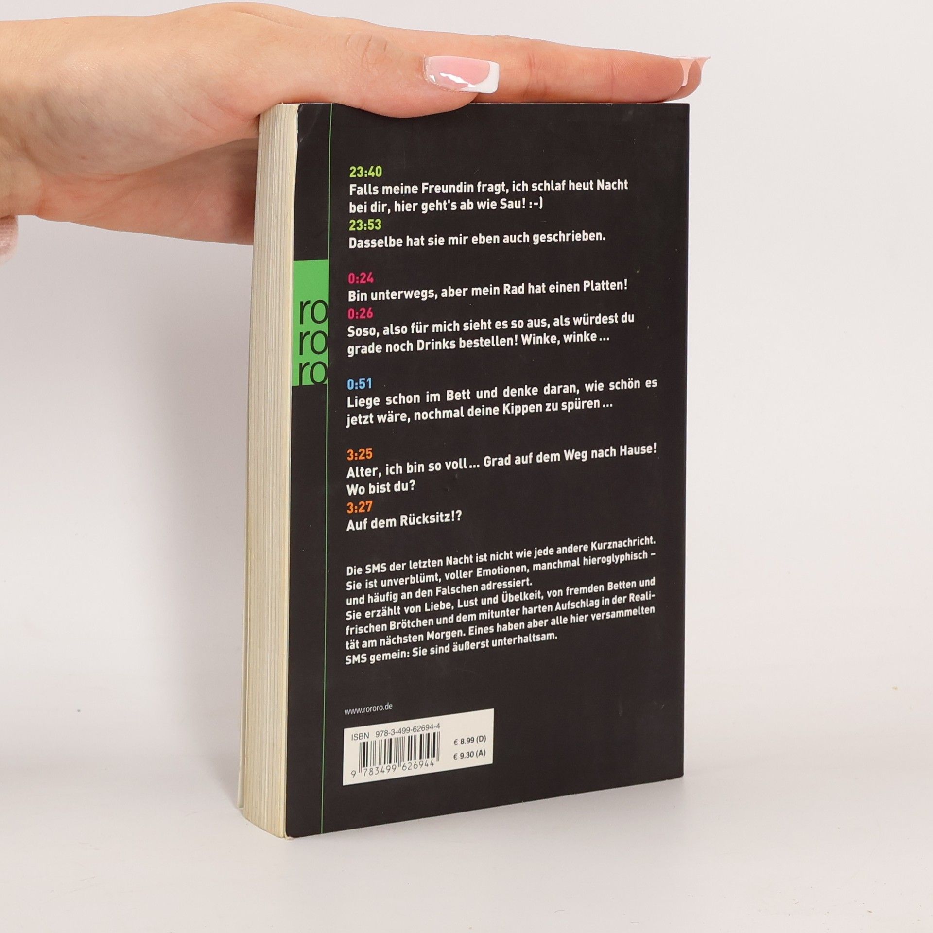 23:40Falls meine Freundin fragt, ich schlaf heut Nacht bei dir, hier gehts ab wie Sau! :-)23:53Dasselbe hat sie mir eben auch geschrieben.0:24Bin unterwegs, aber mein Rad hat einen Platten!0:26Soso, also für mich sieht es so aus, als würdest du grade noch Drinks bestellen! Winke, winke …0:51Liege schon im Bett und denke daran, wie schön es jetzt wäre, nochmal deine Kippen zu spüren …3:25Alter, ich bin so voll ... Grad auf dem Weg nach Hause! Wo bist du?3:27Auf dem Rücksitz!? Die SMS der letzten Nacht ist nicht wie jede andere Kurznachricht. Sie ist unverblümt, voller Emotionen, manchmal hieroglyphisch – und häufig an den Falschen adressiert.Sie erzählt von Liebe, Lust und Übelkeit, von fremden Betten und frischen Brötchen und dem mitunter harten Aufschlag in der Realität am nächsten Morgen. Eines haben aber alle hier versammelten SMS gemein: Sie sind äußerst unterhaltsam.