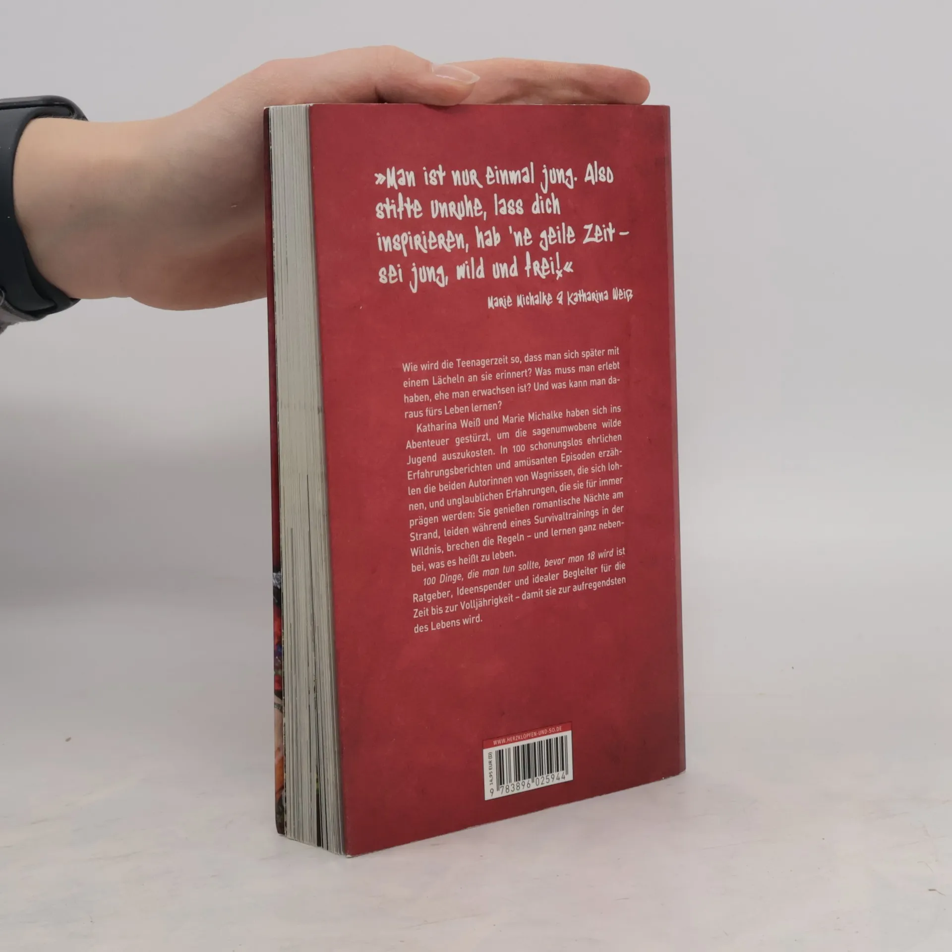 Die erste Liebe, durchfeierte Nächte und der Traum von Freiheit: Katharina Weiß und Marie Michalke haben sich ins Abenteuer gestürzt, um die sagenumwobene wilde Jugend auszukosten. Wie wird die Teenagerzeit so, dass man sich später mit einem Lächeln an sie erinnert? Und was muss man erlebt haben, ehe man erwachsen ist? In 100 schonungslos ehrlichen Erfahrungsberichten erzählen die 17-jährigen Autorinnen von Wagnissen, die sich lohnen, und unglaublichen Erfahrungen, die sie für immer prägen werden: Sie genießen den ersten Kuss, leiden während eines Survivaltrainings, proben den Rock-'n'-Lifestyle an der Seite von Jennifer Rostock – und lernen ganz nebenbei, was es heißt zu leben. »100 Dinge, die man tun sollte, bevor man 18 wird« ist der ideale Begleiter für die Jahre bis zum 18. Geburtstag – damit sie die aufregendsten des Lebens werden.