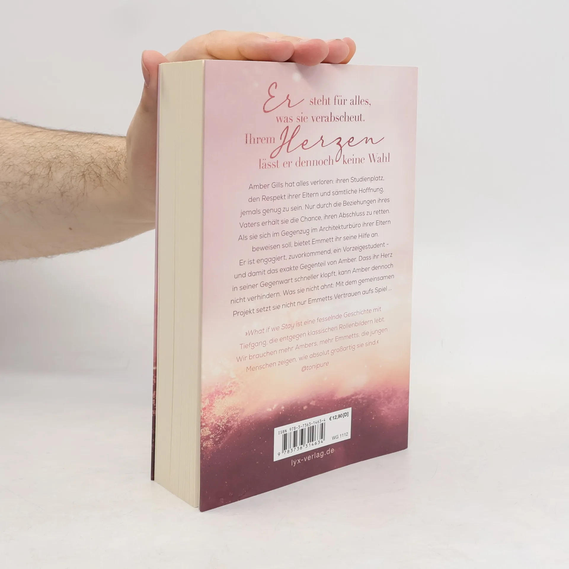 Er steht für alles, was sie verabscheut. Ihrem Herzen lässt er dennoch keine Wahl Amber Gills hat alles verloren: ihren Studienplatz, den Respekt ihrer Eltern und sämtliche Hoffnung, jemals genug zu sein. Nur durch die Beziehungen ihres Vaters erhält sie die Chance, ihren Abschluss zu retten. Als sie sich im Gegenzug im Architekturbüro ihrer Eltern beweisen soll, bietet Emmett ihr seine Hilfe an. Er ist engagiert, zuvorkommend, ein Vorzeigestudent - und damit das exakte Gegenteil von Amber. Dass ihr Herz in seiner Gegenwart schneller klopft, kann Amber dennoch nicht verhindern. Was sie nicht ahnt: Mit dem gemeinsamen Projekt setzt sie nicht nur Emmetts Vertrauen aufs Spiel ... „What if we Stay ist eine fesselnde Geschichte mit Tiefgang, die entgegen klassischen Rollenbildern lebt. Wir brauchen mehr Ambers, mehr Emmetts, die jungen Menschen zeigen, wie absolut großartig sie sind.“ @TONIPURE Band 2 der bewegenden und romantischen New-Adult-Trilogie von Sarah Sprinz
