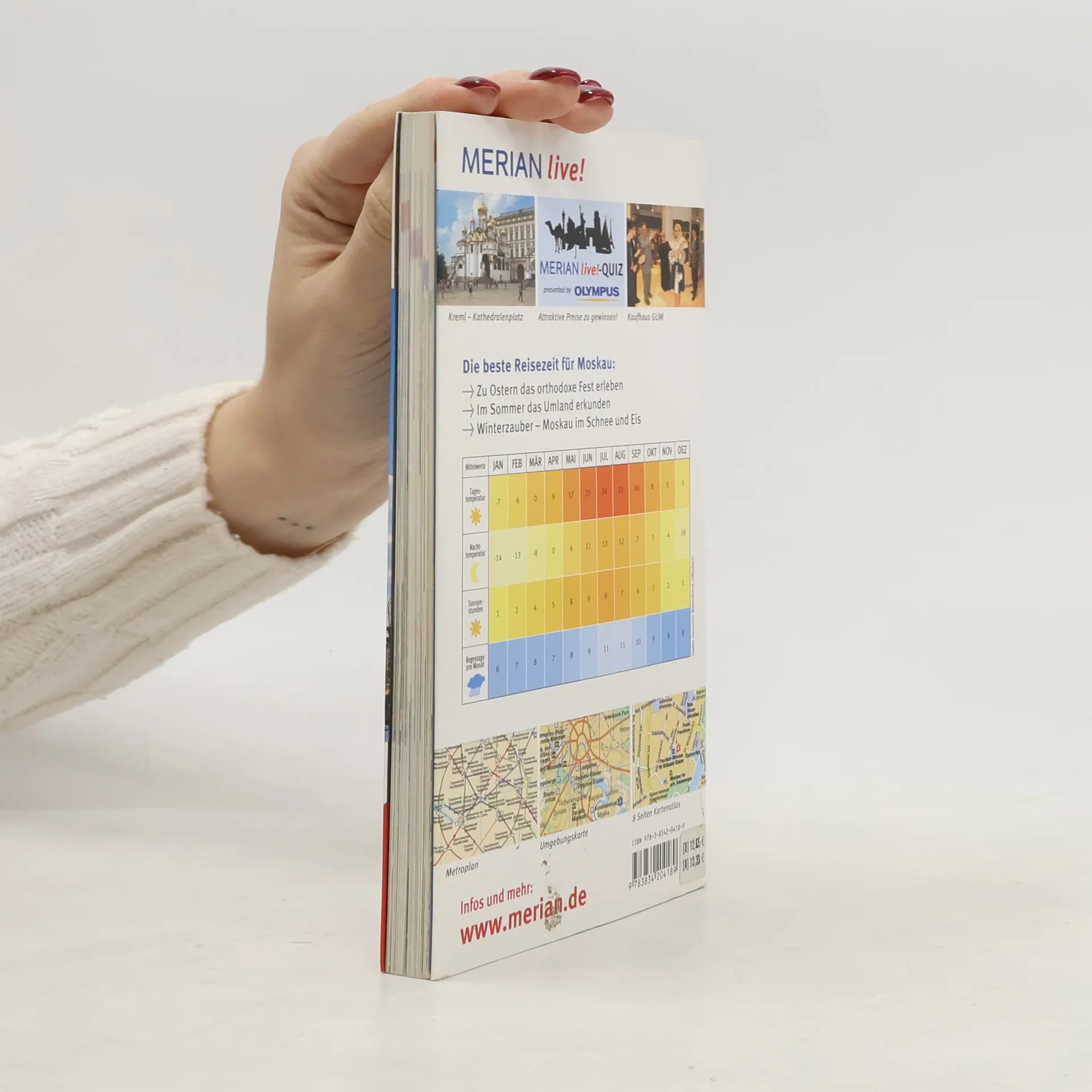 Mehrfach ausgezeichnet als bester Kompakt-Reiseführer: 1. Platz ITB BuchAward! + Jetzt neu mit herausnehmbarem Stadtplan zusätzlich zum Kartenatlas. + Extra: MERIAN-Quiz mit Gewinnspiel! +++ Eine Auswahl aus dem Inhalt - Sehenswertes: Gorki-Park + Kreml + Lenin-Mausoleum + Roter Platz +++ Museen und Galerien: Moskauer Museum für Moderne Kunst + Neue Tretjakow-Galerie + +++ Die 4 schönsten Stadtrundgänge: Kitaj-Gorod + Samoskworetsche + Das Adelsviertel + Vom Tschistoprudnyj-Boulevard zum Lubjanka-Platz +++ Die 5 lohnendsten Ausflüge in die Umgebung: Abramzewo - die Künstlerkolonie + Archangelskoje + Neu-Jerusalem + Peredelkino - ein Ort für Dichter + Kloster Sergijew Posad +++ Ca. 80 Farbfotos, herausnehmbarer Stadtplan plus 8 Seiten Kartenatlas, 1 Übersichtskarte, 1 Stadtplan, 1 Detailplan, Verkehrslinienplan, Sprachführer und Essdolmetscher, MERIAN-TopTen und MERIAN-Tipps. +++ MERIAN-Spezial-Themen: Die neue Moskauer Kunstszene + Badeparadies Banja + Die Moskauer Krimiladys