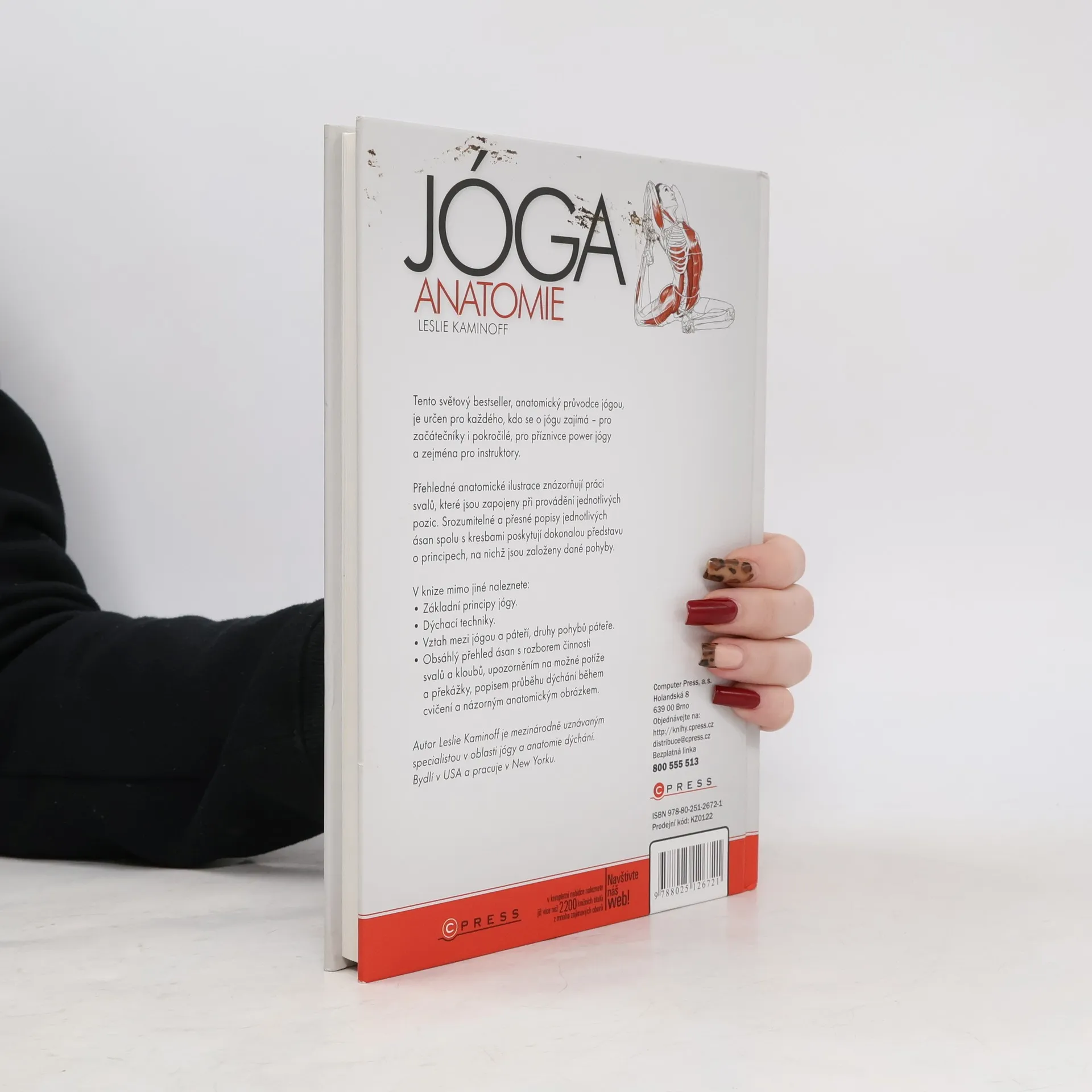 Světový bestseller. Názorná ilustrovaná publikace určená jak zájemcům o cvičení jógy, tak instruktorům a lektorům. Laické veřejnosti přiblíží význam jógy a její blahodárné působení na svalové skupiny, instruktorům pomůže v jejich práci: kniha představuje jednotlivé pozice - asány - a jejich vliv na svaly, zapojené při provádění daných cviků, s přesnými popisy svalů přímo v ilustraci a srozumitelným slovním vysvětlením. Tento světový bestseller, anatomický průvodce jógou, je určen pro každého, kdo se o jógu zajímá pro začátečníky i pokročilé, pro příznivce power jógy a zejména pro instruktory. Přehledné anatomické ilustrace znázorňují práci svalů, které jsou zapojeny při provádění jednotlivých pozic. Srozumitelné a přesné popisy jednotlivých ásan spolu s kresbami poskytují dokonalou představu o principech, na nichž jsou založeny dané pohyby. V knize mimo jiné naleznete: Základní principy jógy. Dýchací techniky. Vztah mezi jógou a páteří, druhy pohybů páteře. Obsáhlý přehled ásan s rozborem činnosti svalů a kloubů, upozorněním na možné potíže a překážky, popisem průběhu dýchání během cvičení a názorným anatomickým obrázkem. Autor Leslie Kaminoff je mezinárodně uznávaným specialistou v oblasti jógy a anatomie dýchání. Bydlí v USA a pracuje v New Yorku.