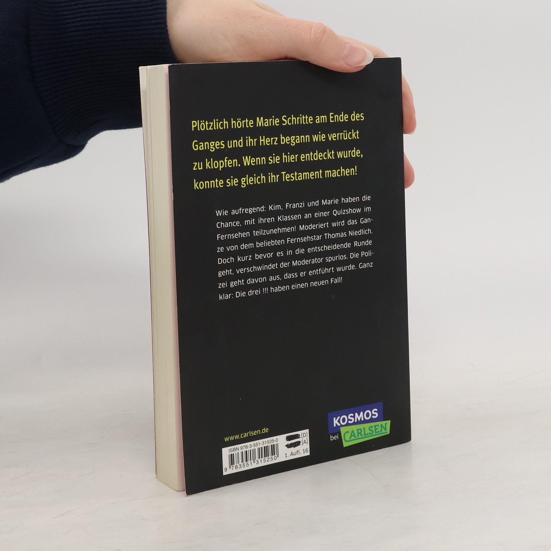 Wie aufregend: Kim, Franzi und Marie haben die Chance, mit ihren Klassen an einer Quizshow im Fernsehen teilzunehmen! Marie träumt schon lange von ihrem ersten Fernsehauftritt, aber auch Kim würde gerne einmal ihr Können beweisen. Moderiert wird die Veranstaltung von dem beliebten Fernsehstar Thomas Niedlich. Doch kurz bevor es in die entscheidende Runde geht, verschwindet der Moderator spurlos. Die Polizei geht davon aus, dass er entführt wurde. Ganz klar: Die drei !!! haben einen neuen Fall!
