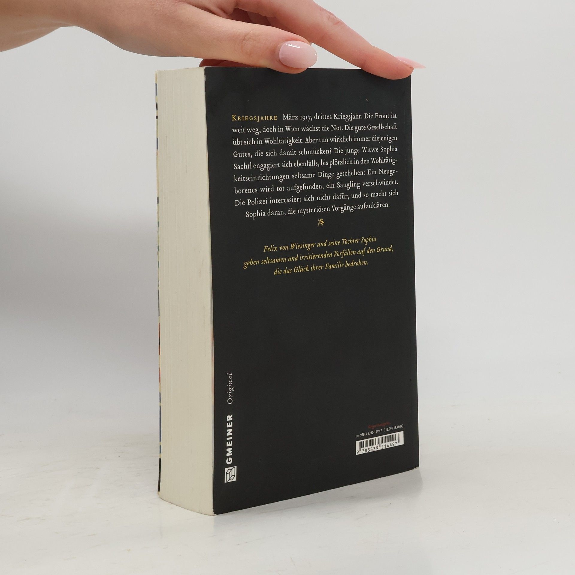 März 1917, drittes Kriegsjahr. Die Front ist weit weg, doch die Not wächst in Wien. Die gute Gesellschaft übt sich in Wohltätigkeit. Aber tun die immer wirklich Gutes, die sich damit schmücken? Die junge Witwe Sophia Sachtl engagiert sich ebenfalls, bis plötzlich in den Wohltätigkeitseinrichtungen seltsame Dinge geschehen: Ein Neugeborenes wird tot aufgefunden, ein Säugling verschwindet. Die Polizei interessiert sich nicht dafür und so macht sich Sophia daran, die mysteriösen Vorgänge aufzuklären.