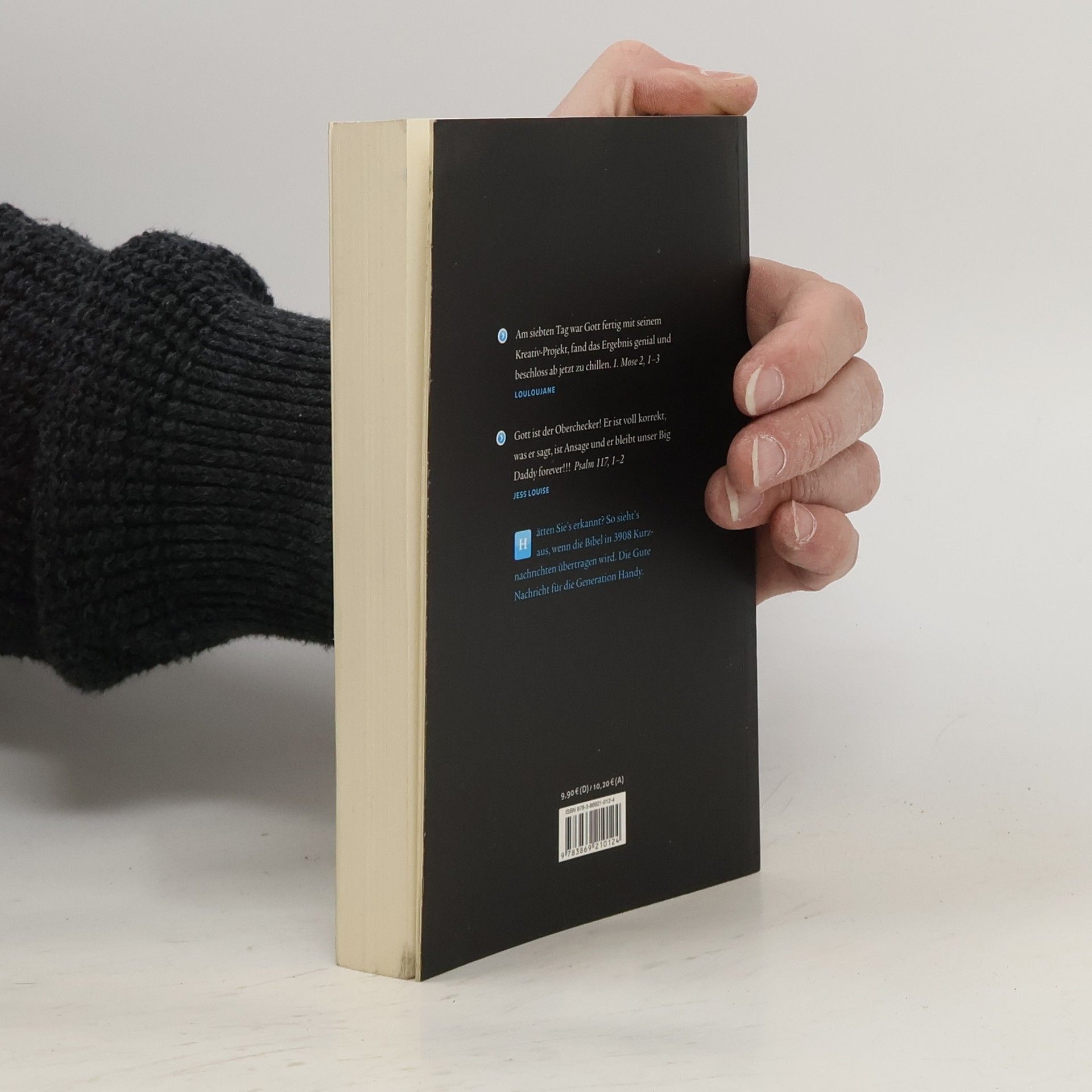 Am siebten Tag war Gott fertig mit seinem Kreativ-Projekt, fand das Ergebnis genial und beschloss ab jetzt zu chillen. 1. Mose 2, 1–3 (louloujane,) Gott ist der Oberchecker! Er ist voll korrekt, was er sagt, ist Ansage und er bleibt unser Big Daddy forever!!! Psalm 117, 1–2 (jess louise) Hätten Sie´s erkannt? So sieht´s aus, wenn die Bibel in 3908 Kurznachrichten übertragen wird. Die Gute Nachricht für die Generation Handy. 500 Jahre nach Luther: Über 3000 Menschen – Alte und Junge, Protestanten, Katholiken und Zweifler – scharen sich aufgeregt um die Bibel. Sie haben eine gemeinsame Mission. Es gilt, Altes und Neues Testament in die heute geläufige Sprache zu übertragen, Twitter- oder auch SMSDeutsch genannt. Das heißt: 3908 Bibelstellen in Kurznachrichten zu je 140 Zeichen zusammenzufassen. Dauern solide Bibelübertragungen in der Regel mehrere Jahrzehnte, so hat man hier noch nicht mal eine Woche Zeit. Der Rekordversuch startet vier Tage vor Pfingsten, am Pfingstsonntag liegen 6000 Zusammenfassungen vor. Dieses Projekt markiert den Auftakt des neuen Internetportals evangelisch. de. Der Bibel-Twitter-Rekord wurde 2009 auf dem Evangelischen Kirchentag in Bremen erreicht. Für das Begleitbuch „Und Gott chillte“ sind die markantesten 3908 Bibelstellen für eine verblüffende Bibelübertragung ausgewählt. Sie eignet sich hervorragend für den Konfirmandenunterricht oder als Inspiration neben der Lutherbibel 1984.