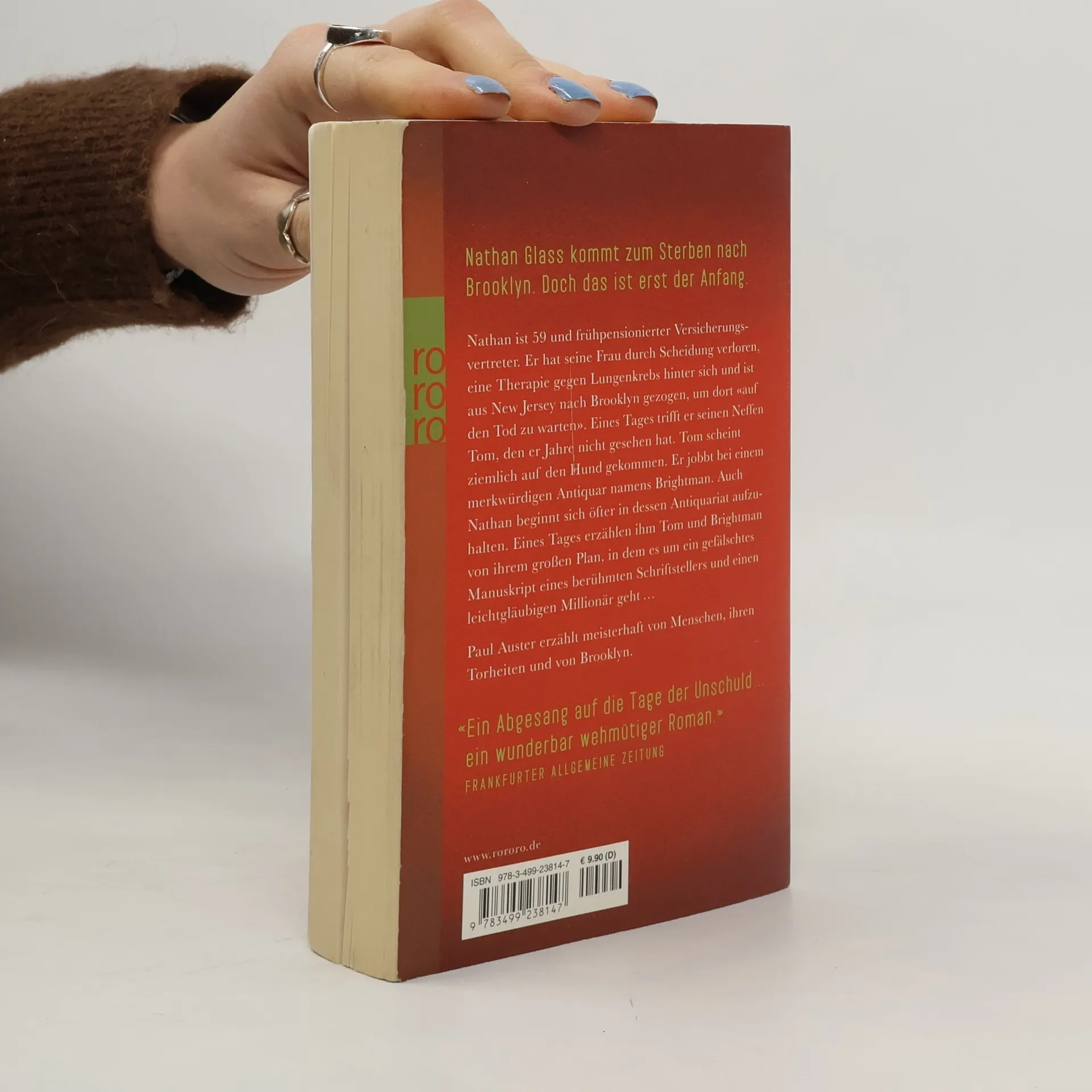 Nathan Glass kommt zum Sterben nach Brooklyn. Doch das ist erst der Anfang.Nathan ist 59 und frühpensionierter Versicherungsvertreter. Er hat seine Frau durch Scheidung verloren, eine Therapie gegen Lungenkrebs hinter sich und ist aus New Jersey nach Brooklyn gezogen, um dort „auf den Tod zu warten.“ Eines Tages trifft er seinen Neffen Tom, den er Jahre nicht gesehen hat. Tom scheint ziemlich auf den Hund gekommen. Er jobbt bei einem merkwürdigen Antiquar namens Brightman. Auch Nathan beginnt sich öfter in dessen Antiquariat aufzuhalten. Eines Tages erzählen ihm Tom und Brightman von ihrem großen Plan, in dem es um ein gefälschtes Manuskript eines berühmten Schriftstellers und einen leichtgläubigen Millionär geht … Paul Auster erzählt meisterhaft von Menschen, ihren Torheiten und von Brooklyn.„Ein Abgesang auf die Tage der Unschuld … ein wunderbar wehmütiger Roman.“ (Frankfurter Allgemeine Zeitung)