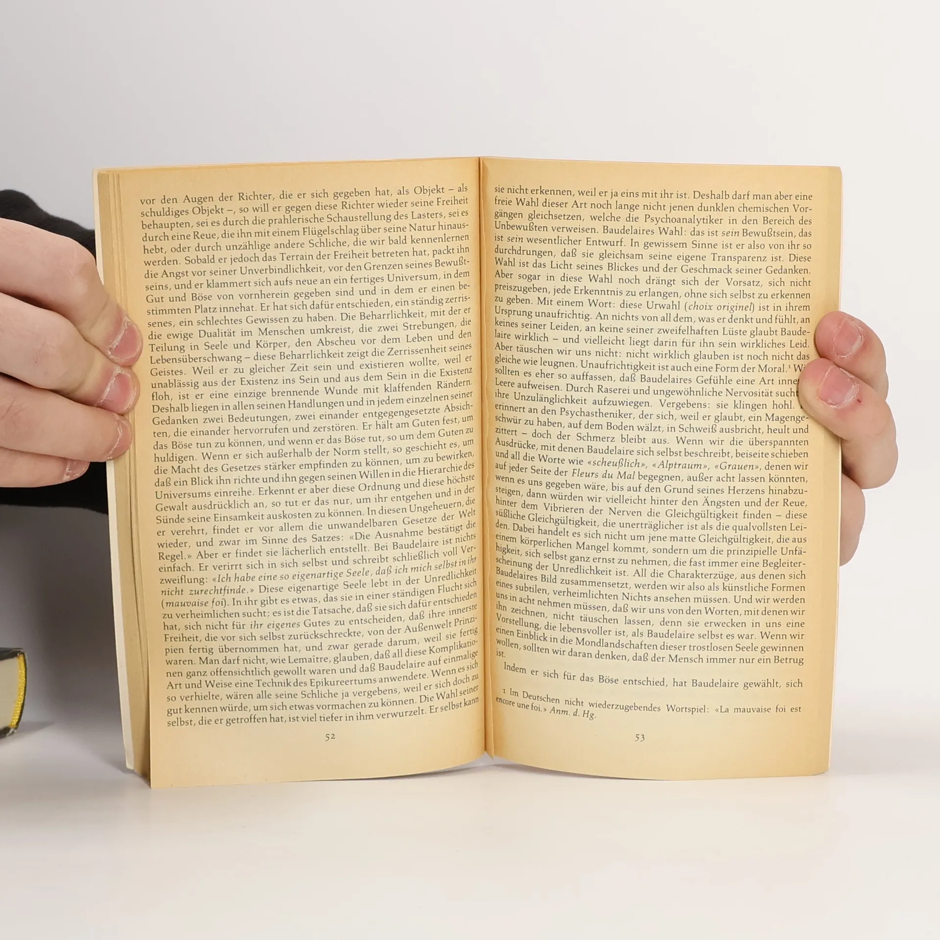 Charles Baudelaire war der erste Schriftsteller, auf den Jean-Paul Sartre seine existentialistische Philosophie der Freiheit anwandte: „Die freie Wahl seiner selbst, die der Mensch trifft, ist absolut identisch mit dem, was man sein Schicksal nennt.“ Sartre behandelt Baudelaire weder als Literaturkritiker noch als Psychologe oder als Soziologe, sondern mit seiner Methode der Einfühlung versucht er, aus persönlichen Bekenntnissen und Briefen herauszulesen,wie dieser größte französische Lyriker des 19. Jahrhunderts, der sein Leben lang unglücklich war, sein unverwechselbares Geschick nicht, wie heute gern behauptet, als unschuldiges Opfer seiner Verhältnisse passiv hinnahm, sondern durch viele freie Deutungen und Schlußfolgerungen Stück für Stück sich selbst bereitete. Sartres Methode hat sich in den folgenden beiden großen Schriftstelleruntersuchungen über Genet und Flaubert unendlich bereichert und verfeinert. Die Fragestellung blieb jedoch dieselbe wie in seinem Buch über Baudelaire.