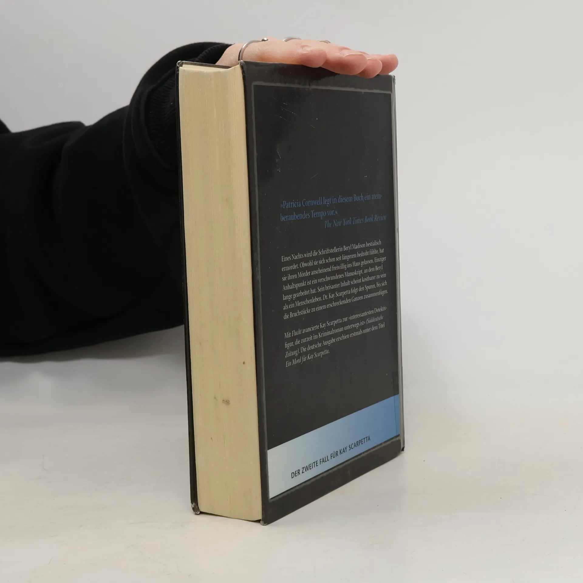 Eines Nachts wird die Schriftstellerin Beryl Madison bestialisch ermordet. Obwohl sie sich schon seit längerem bedroht fühlte, hat sie ihren Mörder anscheinend freiwillig ins Haus gelassen. Einziger Anhaltspunkt ist ein verschwundenes Manuskript, an dem Beryl lange gearbeitet hat. Sein brisanter Inhalt scheint kostbarer zu sein als ein Menschenleben. Dr. Kay Scarpetta folgt den Spuren, bis sich die Bruchstücke zu einem erschreckenden Ganzen zusammenfügen. Mit „Flucht“ avancierte Kay Scarpetta zur „interessantesten Detektivfigur, die zurzeit im Kriminalroman unterwegs ist“ (Süddeutsche Zeitung). Die deutsche Ausgabe erschien erstmals unter dem Titel „Ein Mord für Kay Scarpetta“. „Patricia Cornwell legt in diesem Buch ein atemberaubendes Tempo vor.“ The New York Times Book Review