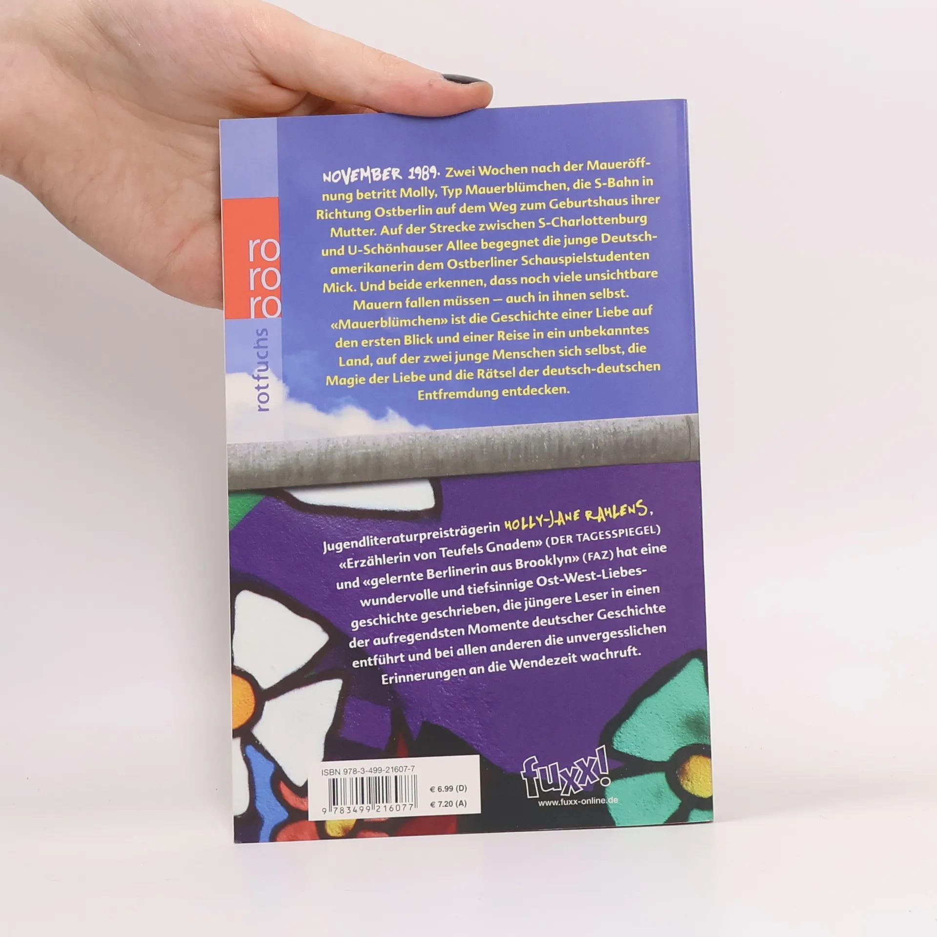 November 1989. Zwei Wochen nach der Maueröffnung betritt Molly, Typ Mauerblümchen, die S-Bahn in Richtung Ostberlin auf dem Weg zum Geburtshaus ihrer Mutter. Auf der Strecke zwischen S-Charlottenburg und U-Schönhauser Allee begegnet die junge Deutschamerikanerin dem Ostberliner Schauspielstudenten Mick. Und beide erkennen, dass noch viele unsichtbare Mauern fallen müssen – auch in ihnen selbst. «Mauerblümchen» ist die Geschichte einer Liebe auf den ersten Blick und einer Reise in ein unbekanntes Land, auf der zwei junge Menschen sich selbst, die Magie der Liebe und die Rätsel der deutsch-deutschen Entfremdung entdecken. Jugendliteraturpreisträgerin Holly-Jane Rahlens, «Erzählerin von Teufels Gnaden» (Der Tagesspiegel) und «gelernte Berlinerin aus Brooklyn» (Frankfurter Allgemeine Zeitung) hat eine wundervolle und tiefsinnige Ost-West-Liebesgeschichte geschrieben, die jüngere Leser in einen der aufregendsten Momente deutscher Geschichte entführt und bei allen anderen die unvergesslichen Erinnerungen an die Wendezeit wachruft.