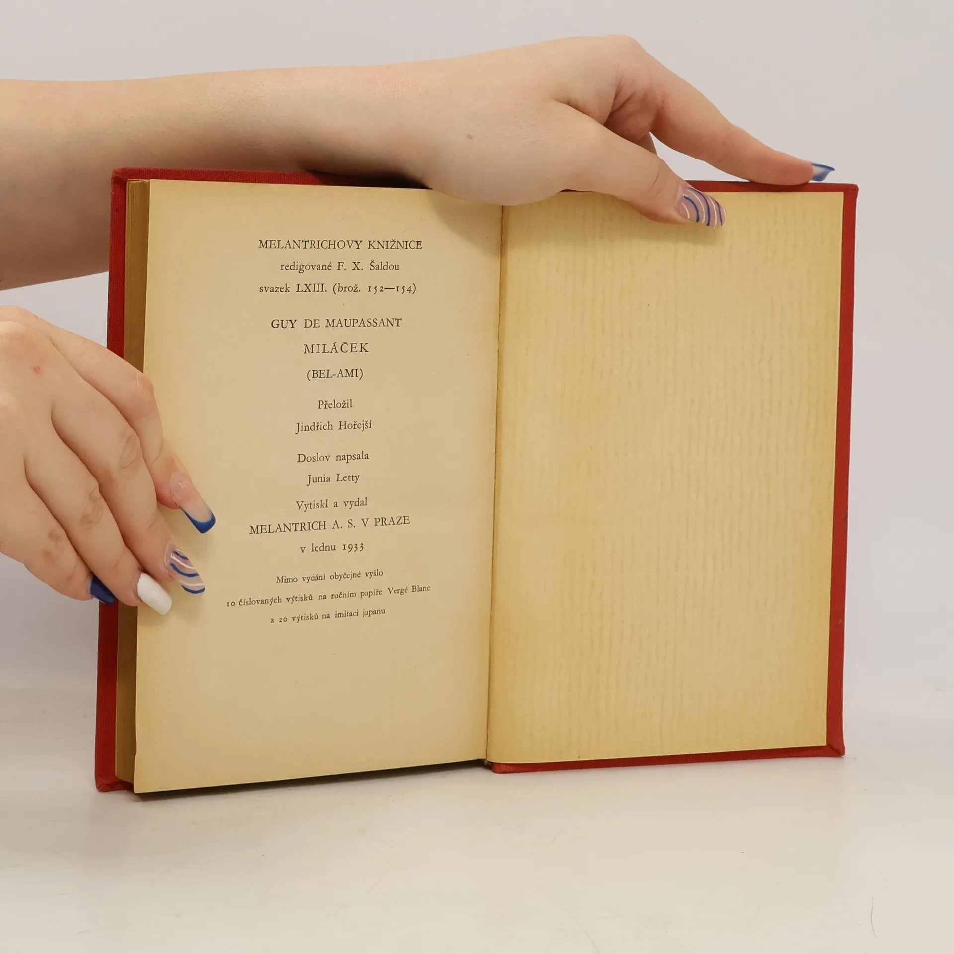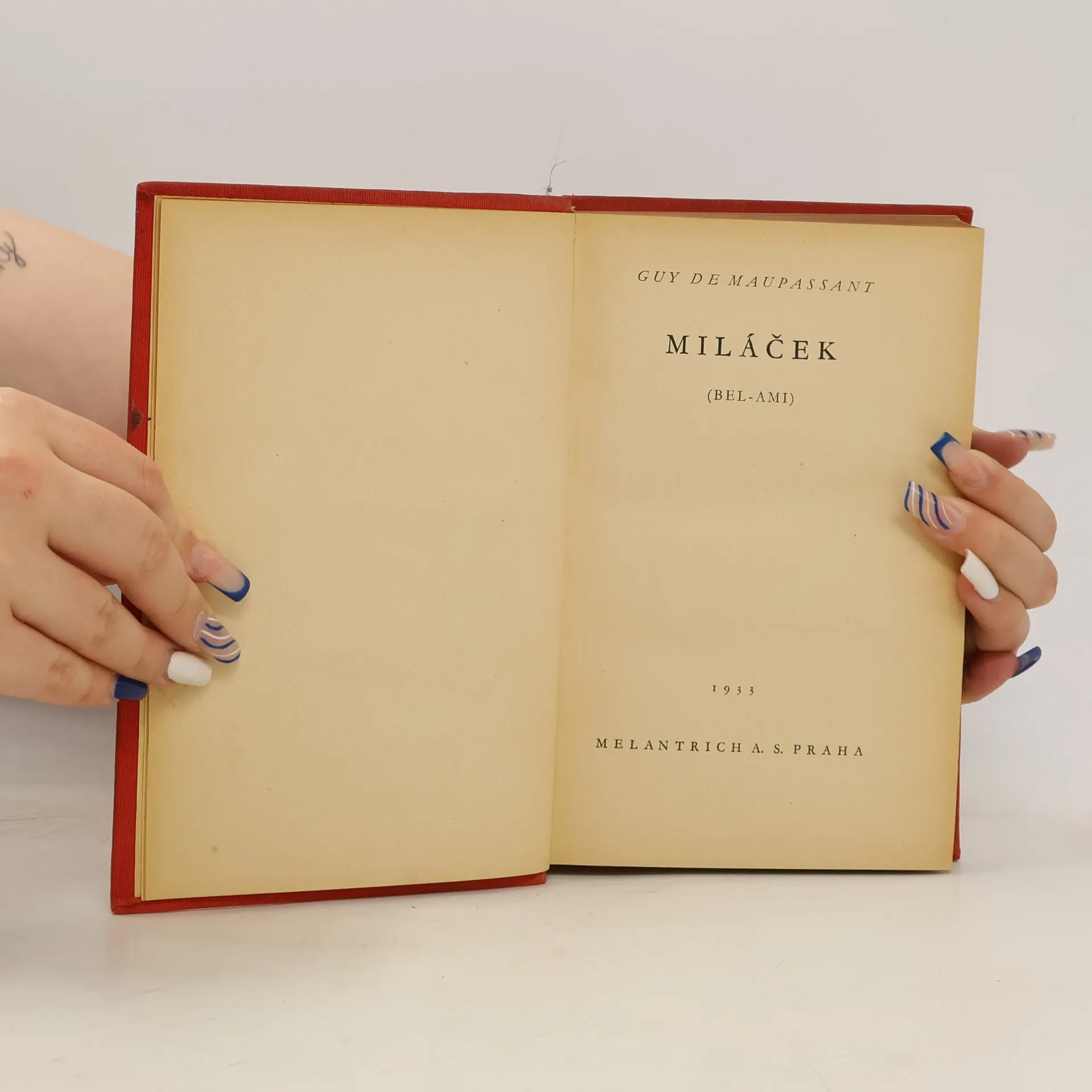 Guy de Maupassant: Miláček. Společensko-kritický román, v němž si mladý novinář za pomoci své přitažlivosti buduje kariéru využíváním žen. Nakonec se cílevědomý mladík dostává až do pařížských šlechtických kruhů. Rok 1933, vydání: neuvedeno, česky, rediguje (upravovat text určený ke zveřejnění): František Xaver Šalda, vytiskl a vydal: nakladatelství Melantrich, a.s. Praha, edice Melantrichova knižnice, svazek LXIII. ISBN: neuvedeno, náklad: "Mimo vydání obyčejné vyšlo 10 číslovaných výtisků na ručním papíře Vergé Blanc a 20 výtisků na imitaci japanu." Pevná vazba celoplátěná nakladatelská s popisem na hřbetu. Strana 335 až 350 = životopis a dílo Guy de Maupassanta, doslov napsala: Junia Letty, překlad: Jindřich Hořejší. Poznámka překladatelova: Správnější název knihy "Bel-Ami" zněl by "Mazlíček". Titul "Miláček" byl ponechán proto, že se v české literatuře již vžil, a že by změna vedla k záměně knihy s doměle jiným dílem Maupassantovým.