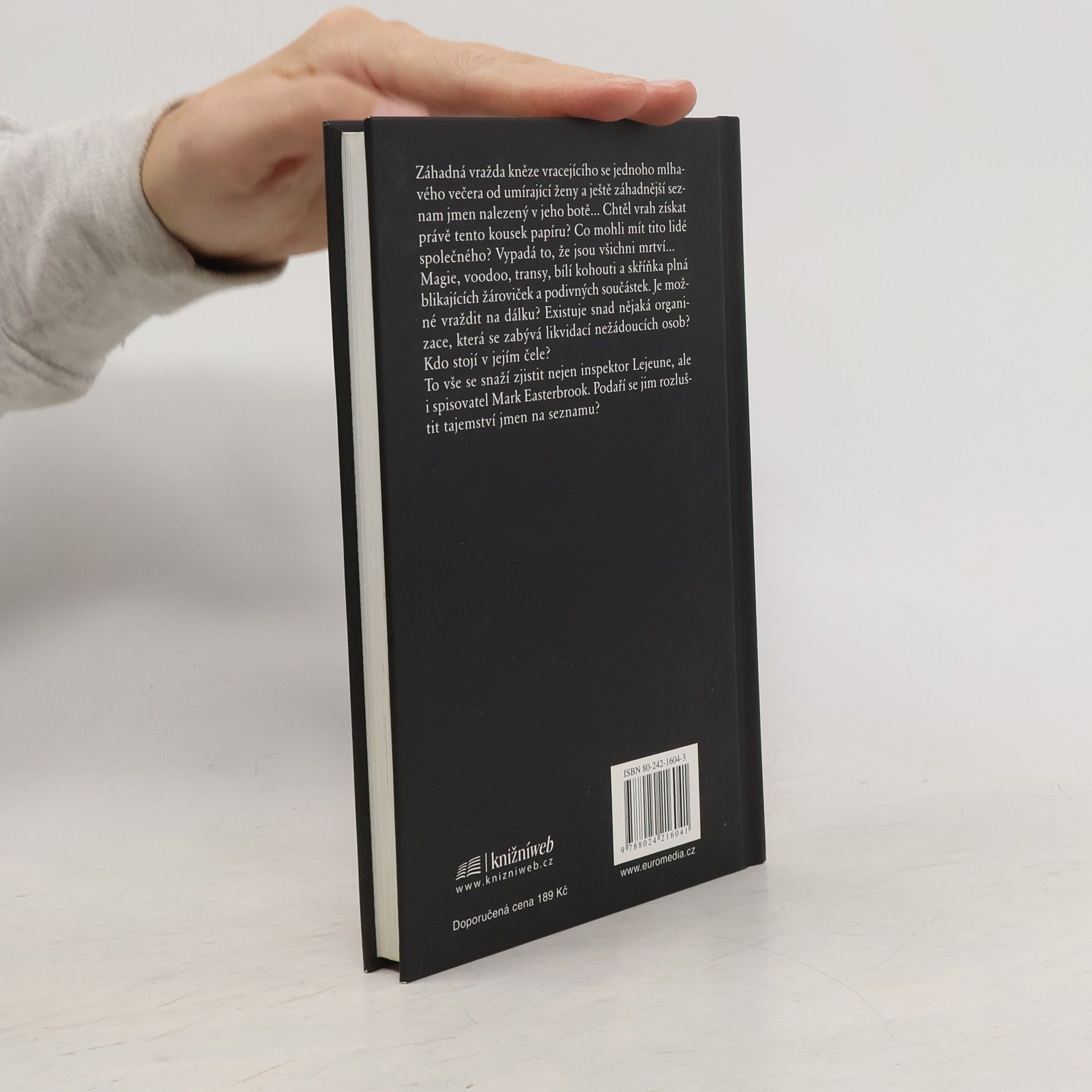 Záhadná vražda kněze vracejícího se jednoho mlhavého večera od umírající ženy a ještě záhadnější seznam jmen nalezený v jeho botě... Chtěl vrah získat právě tento kousek papíru? Co mohli mít tito lidé společného? Vypadá to, že jsou všichni mrtví... Magie, voodoo, transy, bílí kohouti a skříňka plná blikajících žároviček a podivných součástek. Je možné vraždit na dálku? Existuje snad nějaká organizace, která se zabývá likvidací nežádoucích osob? Kdo stojí v jejím čele? To vše se snaží zjistit nejen policejní inspektor Lejeune, ale i spisovatel Mark Easterbrook. Podaří se jim rozluštit tajemství jmen na seznamu?... celý text