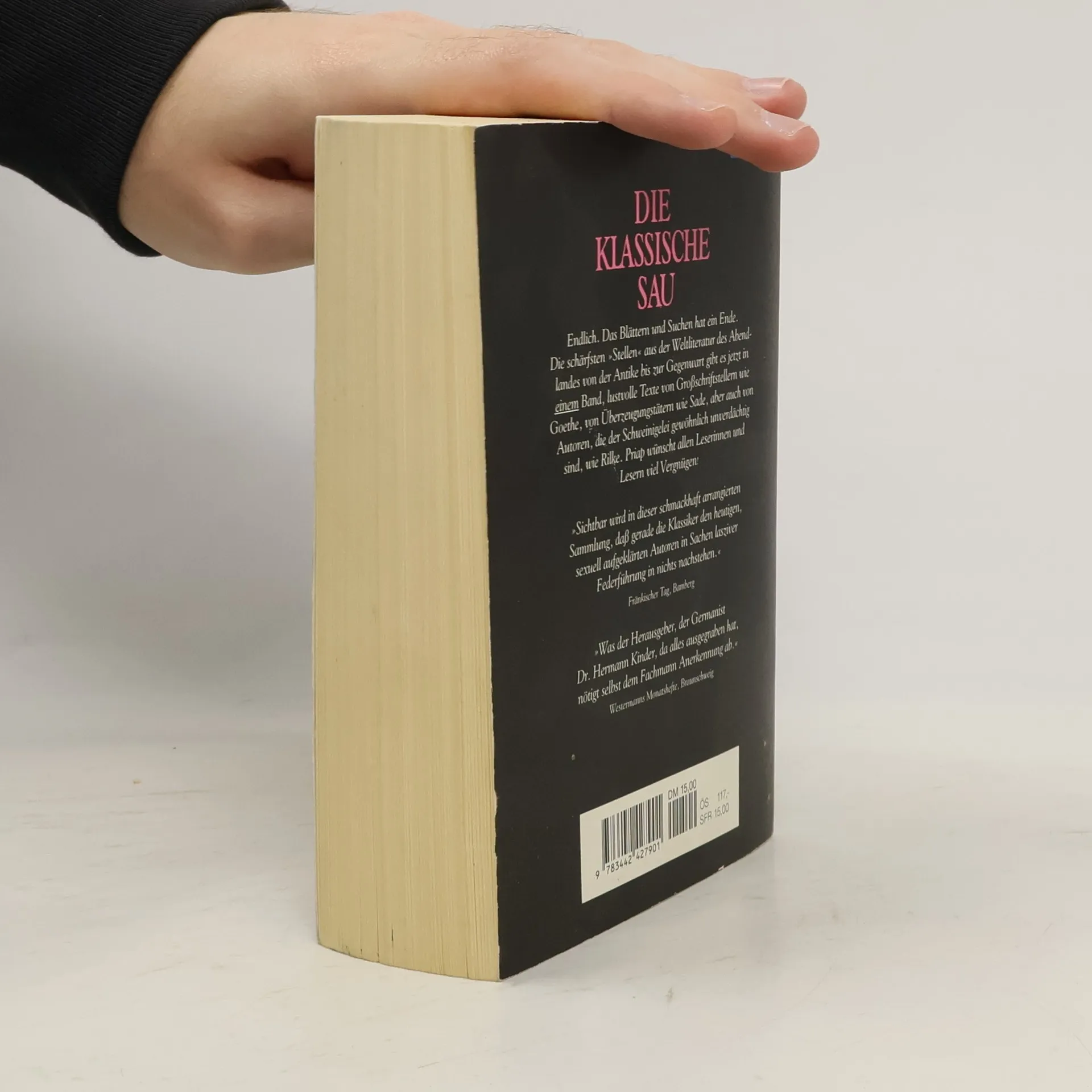 Mit diesem Handbuch der literarischen Hocherotik vereint Hermann Kinder die erotischsten und laszivsten Stellen der Weltliteratur in einem Band. Dem Titel des Buchs liegt die Idee zugrunde, Elite- und Massenliteratur, Kunst und Pornographie zu vereinen, wobei mit »klassisch« auf die Werke kanonisierter Autoren und mit »Sau« auf das Fleischliche, das Pornographische, angespielt wird. Witzig, deftig und obszön begeistert dieses Handbuch der literarischen Hocherotik mit Gedichten, Romanauszügen und Kurzgeschichten. Bekannte klassische und moderne Autoren lassen ihrer Phantasie freien Lauf und erstaunen nicht selten mit der Sprache der Straße, so wie es Goethe tut in »Hanswursts Hochzeit«: »Und hinten drein komm ich bey Nacht / Und vögle sie dass alles kracht