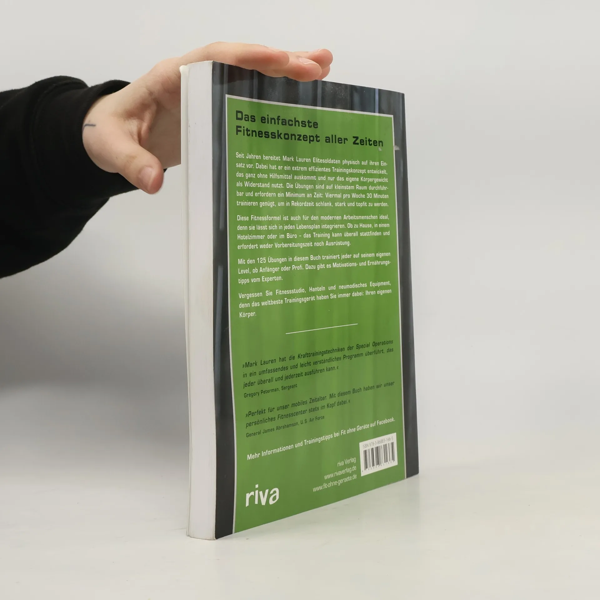 Seit Jahren bereitet Mark Lauren Elitesoldaten physisch auf ihren Einsatz bei Special Operations vor. Dabei hat er ein einfaches und extrem effizientes Trainingskonzept entwickelt, das ganz ohne Hilfsmittel auskommt und nur das eigene Körpergewicht als Widerstand nutzt. Die Übungen sind auch auf kleinstem Raum durchführbar und erfordern ein Minimum an Zeit: Viermal pro Woche 30 Minuten trainieren genügt, um in Rekordzeit schlank, stark und topfit zu werden.Diese Fitnessformel ist auch für den modernen Arbeitsmenschen ideal, denn sie lässt sich in jeden Lebensplan integrieren. Ob zu Hause, in einem Hotelzimmer oder im Büro - das Training kann überall stattfinden. Vorbereitungszeit ist nicht nötig, denn man braucht ja keine Ausrüstung und auch die Anfahrt zum Fitnesscenter entfällt. Mit den 125 Übungen in diesem Buch trainiert jeder auf seinem eigenen Level, ob Anfänger oder Profi. Dazu gibt es Motivations- und Ernährungstipps vom Experten.