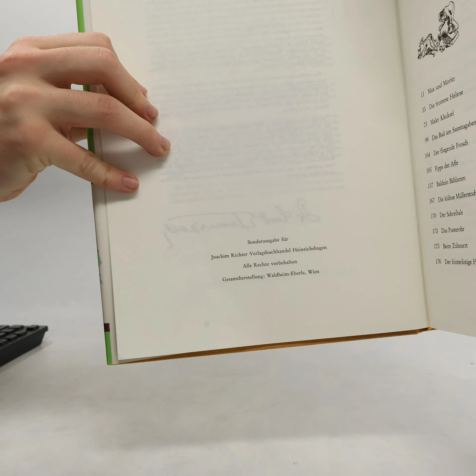 Max und Moritz · Die kühne Müllerstochter Hans Huckebein der Unglücksrabe · Das Bad am Samstagabend Der Schreihals · Das Pusterohr · Die Prise · Fipps der Affe Der Fuchs · Die Drachen · Plisch und Plum Der kleine Pepi mit der neuen Hose Die beiden Enten und der Frosch · Die Fliege Der Bauer und der Windmüller · Das Rabennest Der Lohn einer guten Tat Diogenes und die bösen Buben von Korinth Der Hahnenkampf · Die Rache des Elefanten Der Bauer und sein Schwein · Der hinterlistige Heinrich Die Rutschpartie · Adelens Spaziergang Der unfreiwillige Spazierritt · Zwei Diebe Die Strafe der Faulheit · Der Lohn des Fleisses Der neidische Handwerksbursch Vetter Franz auf dem Esel Der Wurstdieb · Die Brille Die fromme Helene