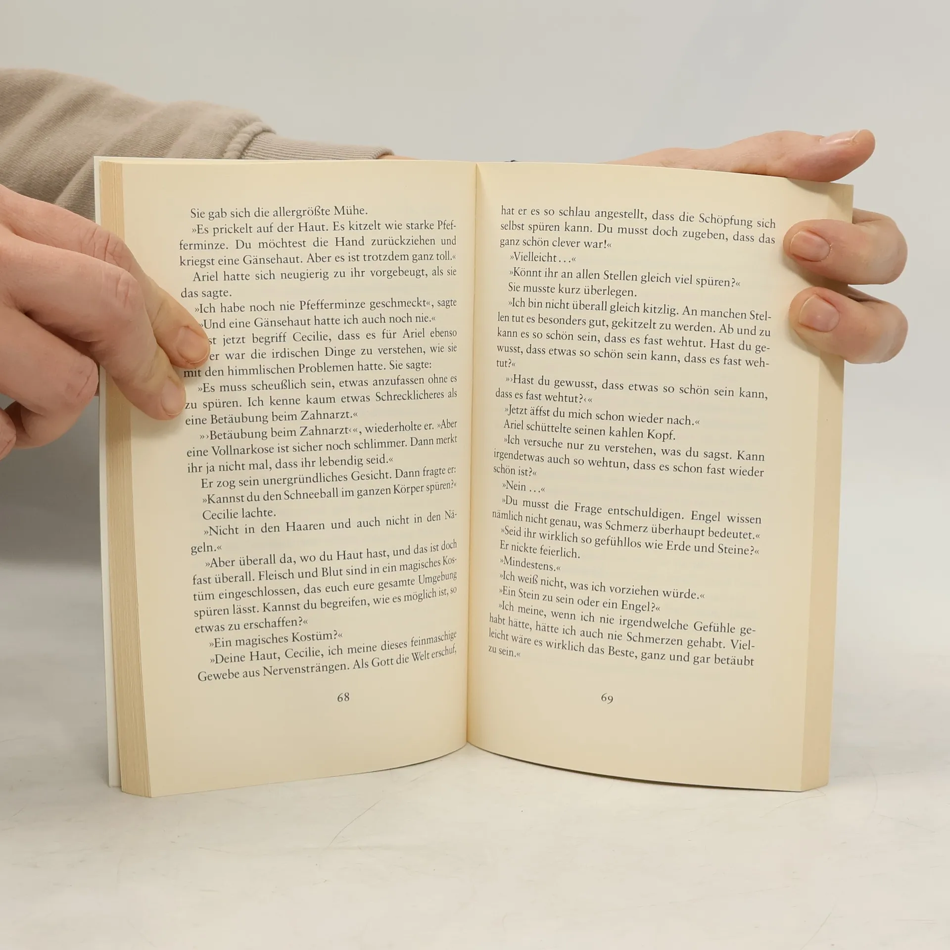Jostein Gaarder greift in einer leicht verständlichen Sprache ein Tabuthema auf: Das Sterben eines krebskranken Kindes. Weihnachtsabend - Cecile liegt krank im Bett, dabei würde sie viel lieber mit ihrer Familie unten im Wohnzimmer feiern. Ihr einziger Trost: ihr redseliger kleiner Bruder Lasse, der sie über sämtliche Weihnachtsvorbereitungen informiert. Cecile ist nicht nur ein bisschen krank, sie hat nicht mal mehr die Kraft, in ihr kleines chinesisches Tagebuch zu schreiben. Trotz ihrer Krankheit wünscht sie sich von ihren Eltern zu Weihnachten Skier. Die alten sind viel zu kurz. Nach der Bescherung, zu der ihr Vater sie heruntergetragen hat, sinkt sie erschöpft ins Bett zurück, als sie plötzlich eine Stimme hört: Ariel heißt er und behauptet ein Engel zu sein. Mit ihm gemeinsam beginnt Cecile über Dinge nachzudenken. Cecile erklärt Ariel, wie eine Marzipanerdbeere schmeckt und Ariel berichtet, dass Engel schon immer dagewesen sind. So sieht sich Cecile zum ersten Mal in ihrem Leben herausgefordert, ihre Existenz in der Welt zu durchdenken. Und als sie mit ihm eines Tages auf ihrer Fensterbank sitzt, findet sie es seltsam, sich selbst auf dem Bett liegen zu sehen. Und doch findet sie sich auch schön.