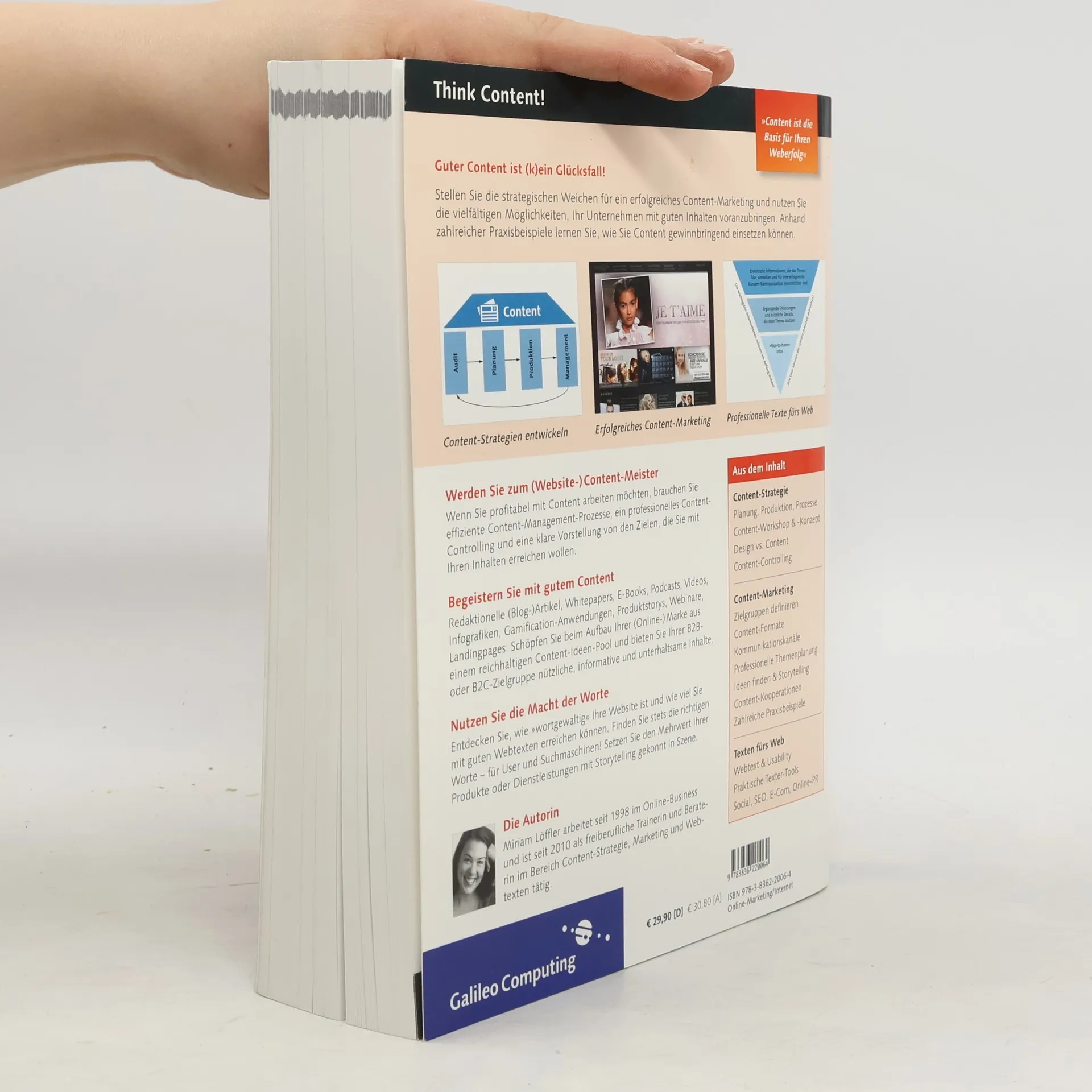 Content-Marketing ist ein zentrales Thema für zukunftsorientierte Online-Marketing-Strategien. Profitieren Sie von der Expertise unserer Autorin und lernen Sie, wie Sie erfolgreiche Content-Strategien für Ihr Online-Unternehmen entwickeln und umsetzen können. Das Buch bietet Ihnen Ideen und Anregungen für effektives Content-Marketing, sowohl für B2B als auch B2C. Es vermittelt das notwendige Rüstzeug, um qualitativ hochwertige Webtexte zu erstellen und zeigt, was ein guter Webtexter leisten muss sowie den wirtschaftlichen Wert guter Texte zu erkennen. Die Autorin beantwortet umfassend alle Fragen rund um Content-Marketing, von der Strategie und Planung bis zur Erstellung und zum Monitoring. Berufseinsteiger erhalten einen schnellen Zugang zur Thematik, während Profis zahlreiche Impulse für ihre Arbeit finden. Der Inhalt umfasst: - Website-Content aus verschiedenen Perspektiven - Unterschiedliche Content-Arten - Zielgruppenrelevante Content-Ideen - Praktische Content-Marketing-Aktionen - Entwicklung der richtigen Content-Strategie - Launch- und Relaunch-Projekte - Gezielter Auf- und Ausbau von Web-Inhalten - Organisation von Content im Tagesgeschäft - Erstellung guter Texte unter Berücksichtigung von Usability und Design - Das Handwerk des Webtextens