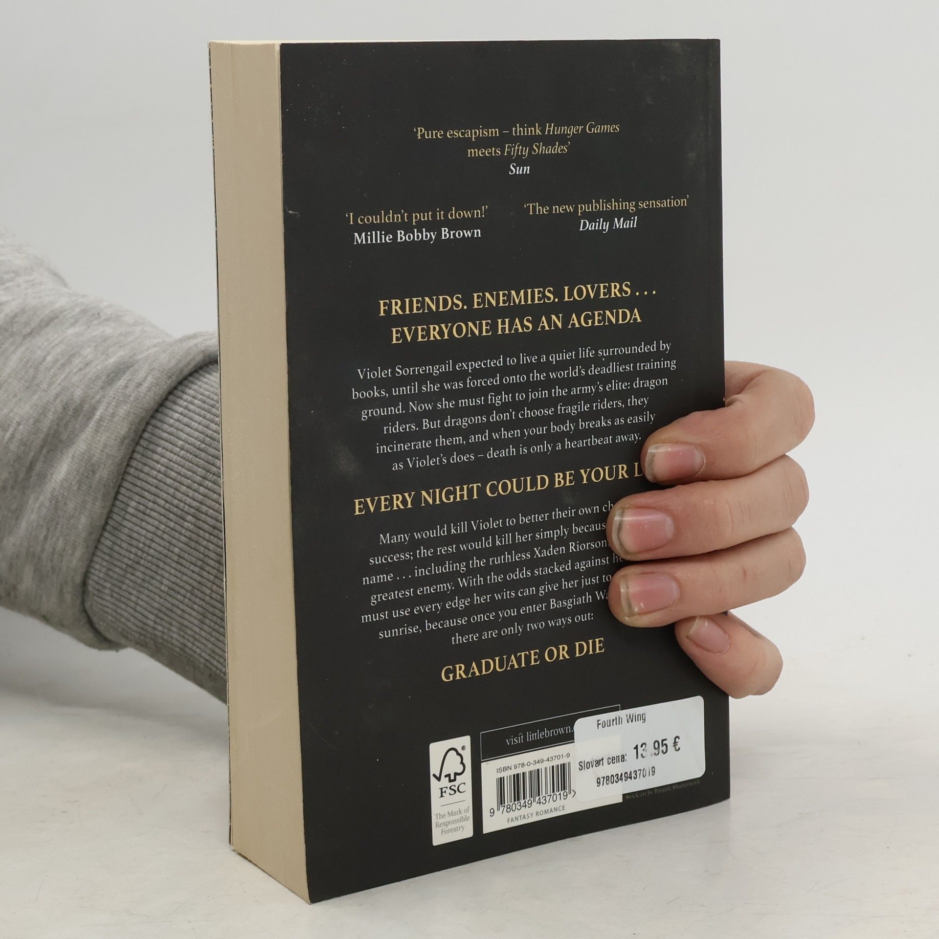 Twenty-year-old Violet Sorrengail was supposed to enter the Scribe Quadrant, living a quiet life among books and history. Now, the commanding general - also known as her tough-as-talons mother - has ordered Violet to join the hundreds of candidates striving to become the elite of Navarre: dragon riders. But when you're smaller than everyone else and your body is brittle, death is only a heartbeat away . . . because dragons don't bond to 'fragile' humans. They incinerate them. With fewer dragons willing to bond than cadets, most would kill Violet to better their own chances of success. The rest would kill her just for being her mother's daughter - like Xaden Riorson, the most powerful and ruthless wingleader in the Riders Quadrant. She'll need every edge her wits can give her just to see the next sunrise. Yet, with every day that passes, the war outside grows more deadly, the kingdom's protective wards are failing, and the death toll continues to rise. Even worse, Violet begins to suspect leadership is hiding a terrible secret. Everyone at Basgiath has an agenda, and every night could be your last. So, sleep with one eye open because once you enter, there are only two ways out: graduate or die .