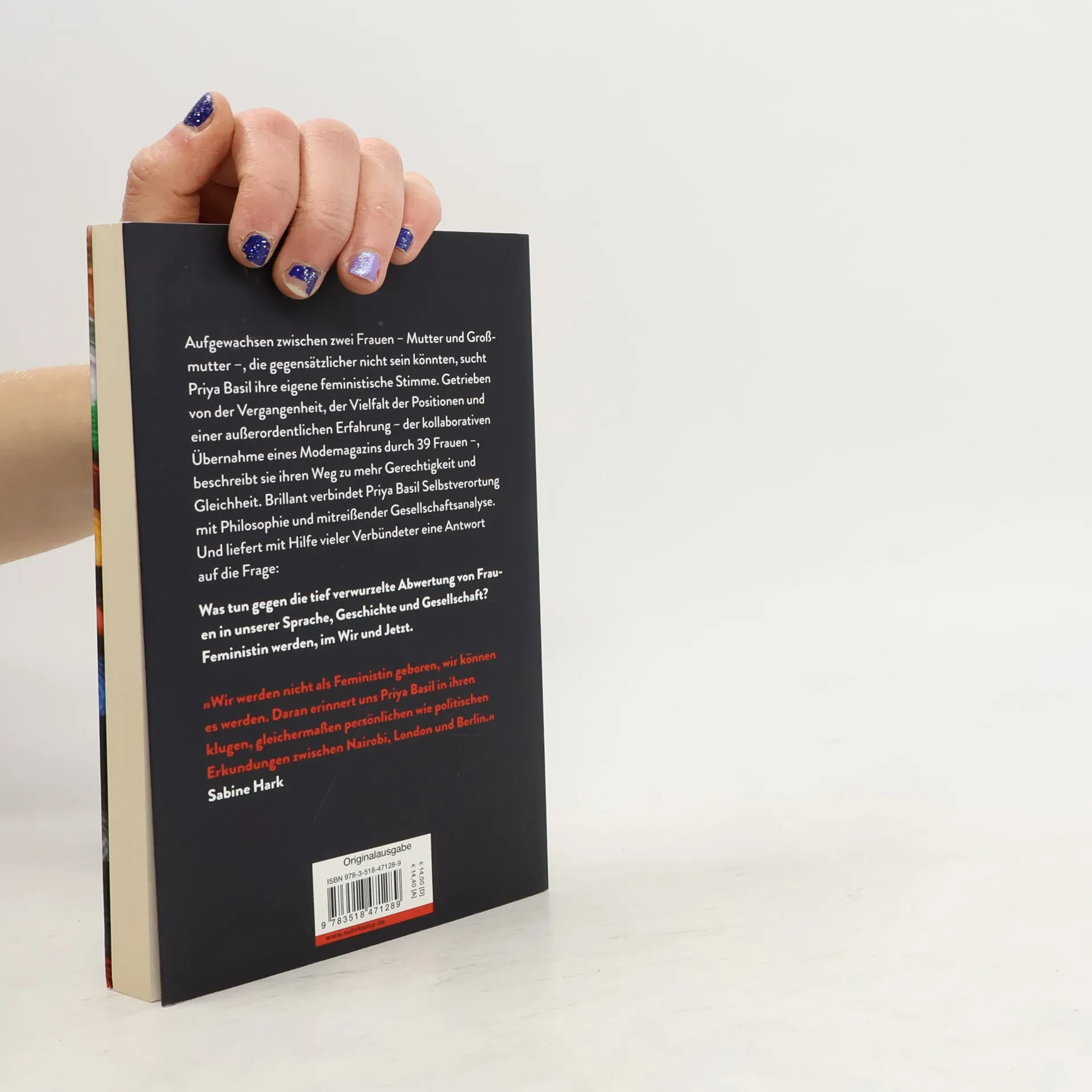 Aufgewachsen zwischen zwei Frauen – Mutter und Großmutter –, die gegensätzlicher nicht sein könnten, sucht Priya Basil ihre eigene feministische Stimme. Getrieben von der Vergangenheit, der Vielfalt der Positionen und einer außerordentlichen Erfahrung – der kollaborativen Übernahme eines Modemagazins durch 39 Frauen – beschreibt sie ihren Weg zu mehr Gerechtigkeit und Gleichheit. Brilliant verbindet Priya Basil Selbstverortung mit Philosophie und mitreißender Gesellschaftsanalyse. Und liefert mit Hilfe vieler Verbündeter eine Antwort auf die Frage: Was tun gegen die tief verwurzelte Abwertung von Frauen in unserer Sprache, Geschichte und Gesellschaft? Feministin werden, im Wir und Jetzt.