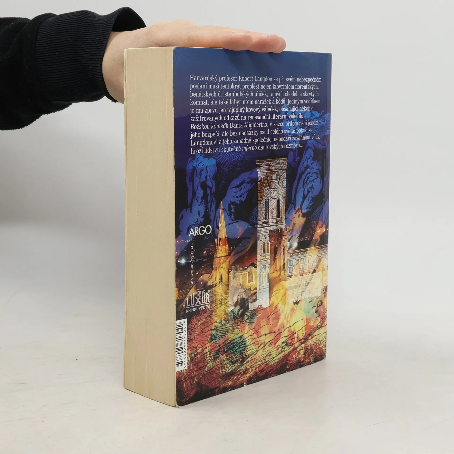 Harvardský profesor Robert Langdon se při svém nebezpečném poslání musí tentokrát proplést nejen labyrintem florentských, benátských či istambulských uliček, tajných chodeb a skrytých komnat, ale také labyrintem narážek a Kódů. Jediným vodítkem je mu zprvu jen tajuplný kovový váleček, obsahující několik zašifrovaných odkazů na renesanční literární veledílo- Božskou komedii Danta Alighieriho. V sázce přitom není jenom jeho bezpečí, ale bez nadsázky osud celého světa: pokud se Langdonovi a jeho záhadné společnici nepodaří zasáhnout včas, hrozí lidstvu skutečné inferno Dantových rozměrů...