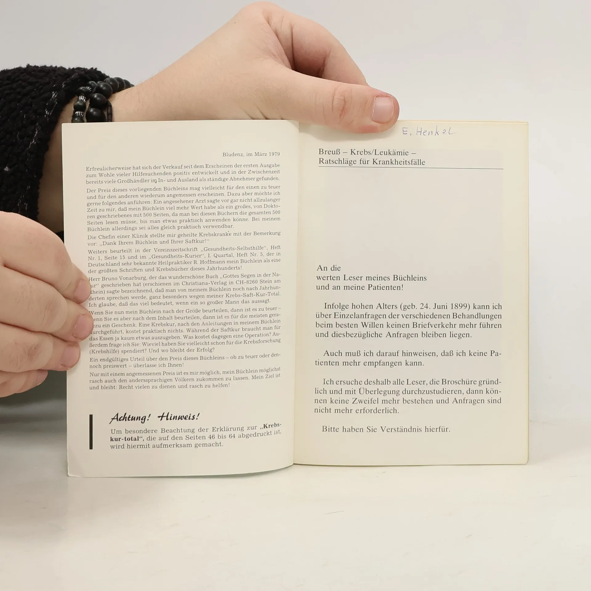 Unser Bestseller, das Buch von Rudolf Breuss „KREBS/Leukämie und andere scheinbar unheilbare Krankheiten mit natürlichen Mitteln heilbar“ wurde von ihm 1978 geschrieben und noch in seinem Todesjahr erweitert und verbessert. Wir haben das Werk seit seinem Tode im Jahre 1990 inhaltlich bewußt nicht geändert und komplett so belassen, wie es der Heilkundige seinerzeit herausgab. Neben Krebs und Leukämie befaßt sich Rudolf Breuß mit einer ganzen Reihe von Krankheiten und gibt wertvolle Ratschläge. Kernpunkt ist aber sein Kampf gegen den Krebs. Seine Therapie bezeichnet er auch als Operation ohne Messer und beschreibt seine Krebskur ausführlich. Beim Fasten löst der Körper alles auf, was körperfremd ist, das heißt, was nicht in den Körper hineingehört. Auf diese, der Naturheilkunde bekannte Tatsache, beruft sich der österreichische erfahrene Naturheilkundige Rudolf Breuß bei seiner „Krebskur total“: „Die Krebsgeschwulst ist ein selbständiges Gewächs und diese Zellen können nur durch Aushungern mit der Saftkur aufgezehrt werden.“ Rudolf Breuß hat für seine 42tägige Fastenkur ein Saftgemisch zusammengestellt, welches in der Hauptsache aus Roten Rüben, aus Möhren, Sellerieknollen, Rettich und Kartoffeln besteht, dazu kommen spezielle Teemischungen. Mit dieser Saftkur konnte Rudolf Breuß seit 1950 vielen nicht mehr operierbaren, von Ärzten aufgegebenen Krebskranken zur Gesundheit verhelfen. 164 Seiten