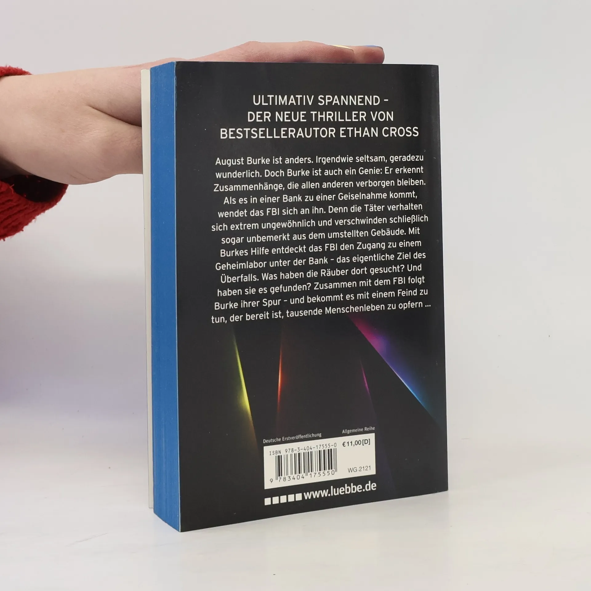 Eine neue rasante Thriller-Serie von Bestsellerautor Ethan Cross, dem Autor der Shepherd-Thriller August Burke ist anders. Irgendwie seltsam, geradezu wunderlich. Doch Burke ist auch ein Genie: Er erkennt Zusammenhänge, die allen anderen verborgen bleiben. Als es in einer Bank zu einer Geiselnahme kommt, wendet das FBI sich an ihn. Denn die Täter verhalten sich extrem ungewöhnlich und verschwinden schließlich sogar unbemerkt aus dem umstellten Gebäude. Mit Burkes Hilfe entdeckt das FBI den Zugang zu einem Geheimlabor unter der Bank - das eigentliche Ziel des Überfalls. Was haben die Räuber dort gesucht? Und haben sie es gefunden? Zusammen mit Special Agent Carter folgt Burke ihrer Spur - und bekommt es mit einem Feind zu tun, der bereit ist, tausende Menschenleben zu opfern.