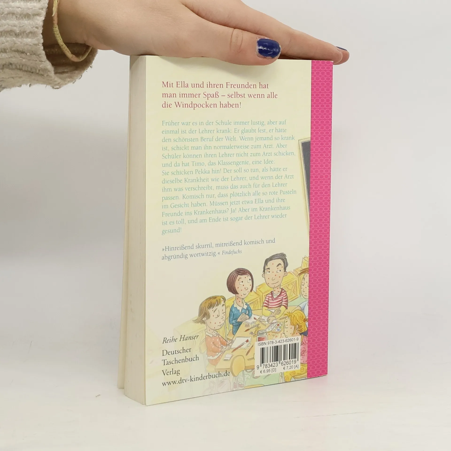 Ella und der Windpockenalarm! Früher war es in der Schule immer lustig, aber auf einmal ist der Lehrer krank: Er glaubt doch tatsächlich, den schönsten Beruf der Welt zu haben. Wenn jemand so krank ist, schickt man ihn normalerweise zum Arzt, aber Schüler können ihren Lehrer ja nicht zum Arzt beordern – und da hat Timo, das Klassengenie, eine Idee: Sie schicken Pekka hin! Der soll so tun, als hätte er dieselbe Krankheit, und wenn der Arzt ihm was verschreibt, muss das auch für den Lehrer passen. Doch anscheinend ist der Lehrer noch kränker, als Ella und ihre Freunde dachten.