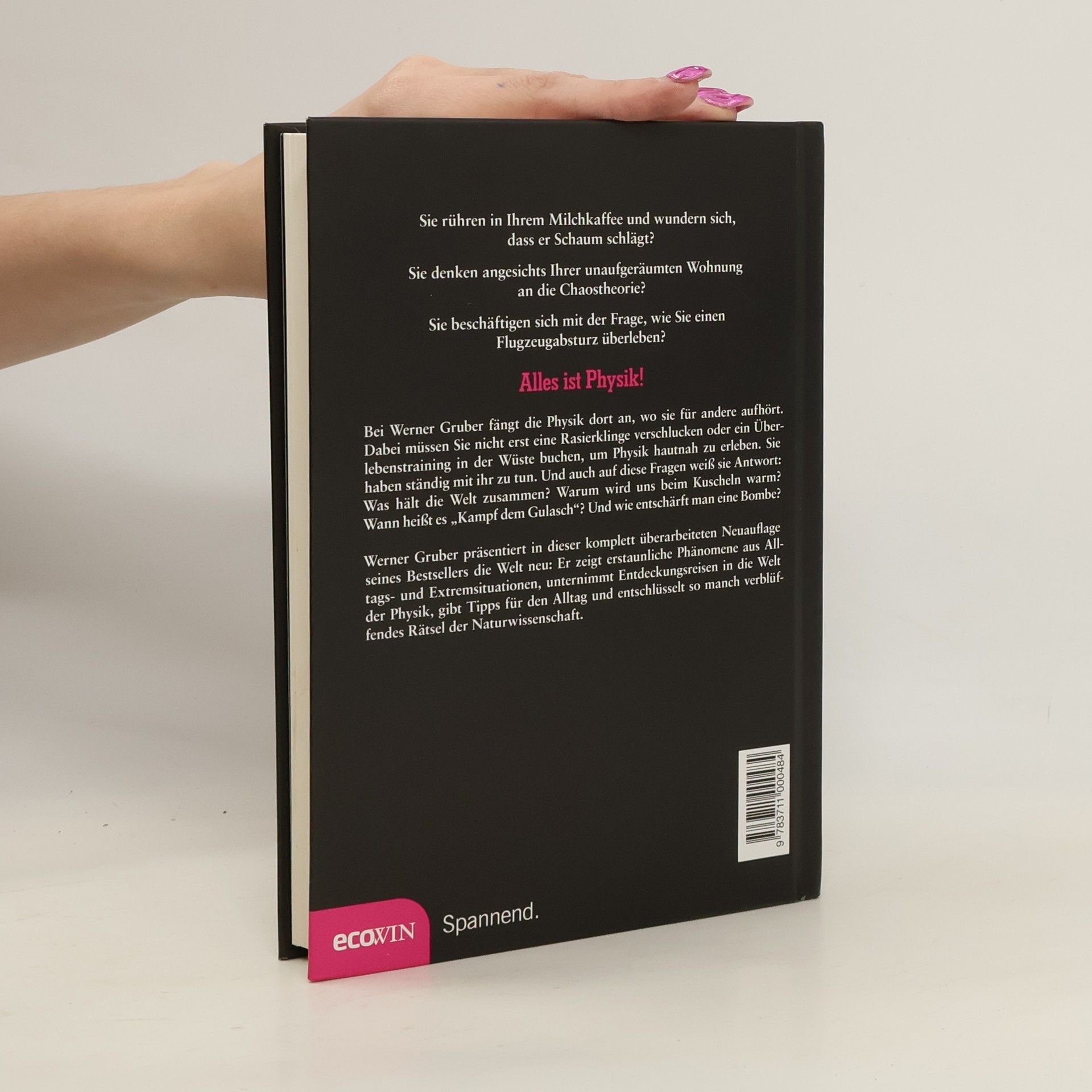Sie rühren in Ihrem Milchkaffee und wundern sich, dass er Schaum schlägt? Sie denken angesichts Ihrer unaufgeräumten Wohnung an die Chaostheorie? Sie beschäftigen sich mit der Frage, wie Sie einen Flugzeugabsturz überleben? Alles ist Physik! Bei Werner Gruber fängt die Physik dort an, wo sie für andere aufhört. Dabei müssen Sie nicht erst eine Rasierklinge verschlucken oder ein Überlebenstraining in der Wüste buchen, um Physik hautnah zu erleben. Sie haben ständig mit ihr zu tun. Und auch auf diese Fragen weiß sie Antwort: Was hält die Welt zusammen? Warum wird uns beim Kuscheln warm? Wann heißt es „Kampf dem Gulasch“? Und wie entschärft man eine Bombe? Werner Gruber präsentiert in dieser komplett überarbeiteten Neuauflage seines Bestsellers die Welt neu: Er zeigt erstaunliche Phänomene aus Alltags- und Extremsituationen, unternimmt Entdeckungsreisen in die Welt der Physik, gibt Tipps für den Alltag und entschlüsselt so manch verblüffendes Rätsel der Naturwissenschaft.