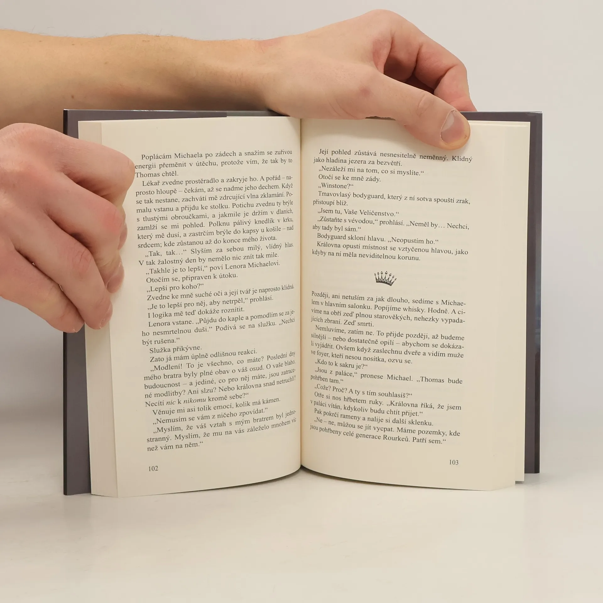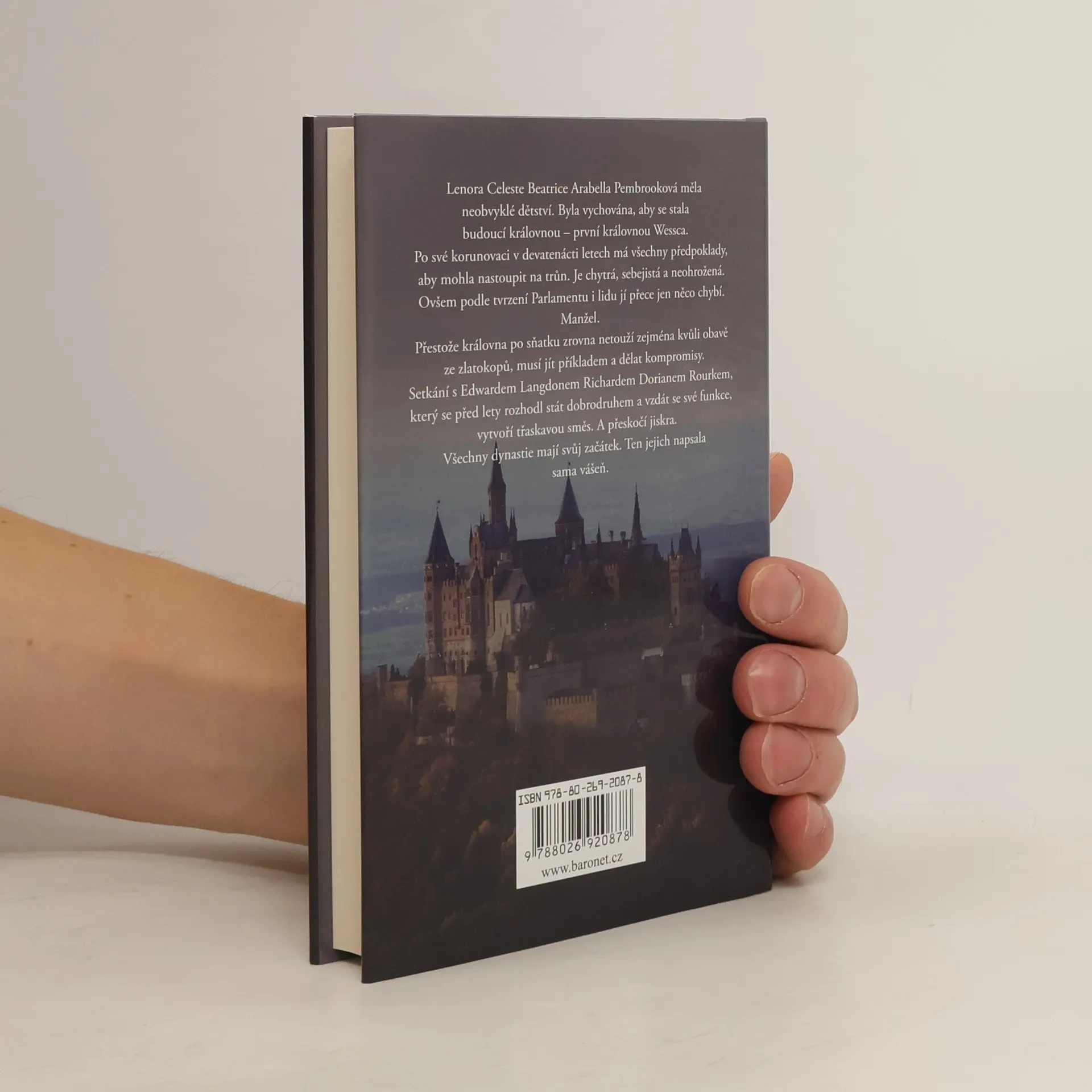 Lenora Celeste Beatrice Arabella Pembrooková měla neobvyklé dětství. Byla vychována, aby se stala budoucí královnou – první královnou Wesska.Po své korunovaci v devatenácti letech má všechny předpoklady, aby mohla nastoupit na trůn. Je chytrá, sebejistá a neohrožená. Ovšem podle tvrzení parlamentu i lidu jí přece jen něco chybí.Manžel.Přestože královna po sňatku zrovna netouží zejména kvůli obavě ze zlatokopů, musí jít příkladem a dělat kompromisy. Setkání s Edwardem Langdonem Richardem Dorianem Rourkem, který se před lety rozhodl stát se dobrodruhem a vzdát se své funkce, vytvoří třaskavou směs. A přeskočí jiskra. Jiskra, kterou se pokusí uhasit každý intrikán v paláci.Všechny dynastie mají svůj začátek. Ten jejich napsala sama vášeň.