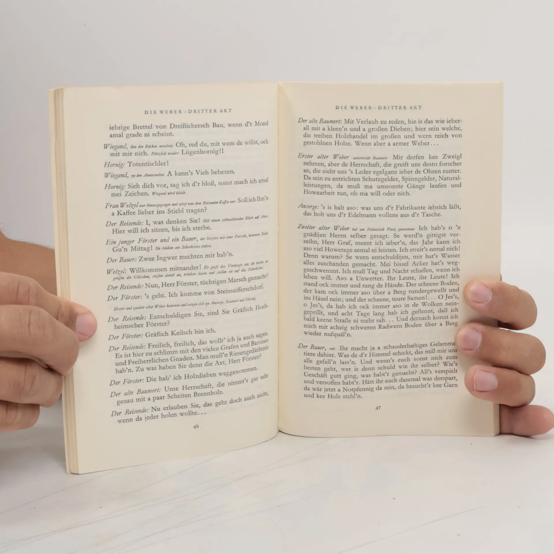 Ein Funke genügt: Als ein hungerleidender Junge zusammenbricht, kommt es zu Protesten der ausgebeuteten Weber vor der Villa des Fabrikanten Dreißiger. Die Situation eskaliert. Hauptmanns Drama über den schlesischen Weberaufstand von 1844 war ein Politikum – der ersten öffentlichen Aufführung in Berlin 1894 ging ein langwieriger Zensurprozess voraus, Kaiser Wilhelm II. kündigte seine Loge im »Deutschen Theater«, Sozialdemokraten jubelten. Es betrat aber auch ästhetisches Neuland: Nicht mehr ein Individuum ist »Held« des Dramas, sondern eine Gruppe gleichförmiger Elendsgestalten – die Weber.