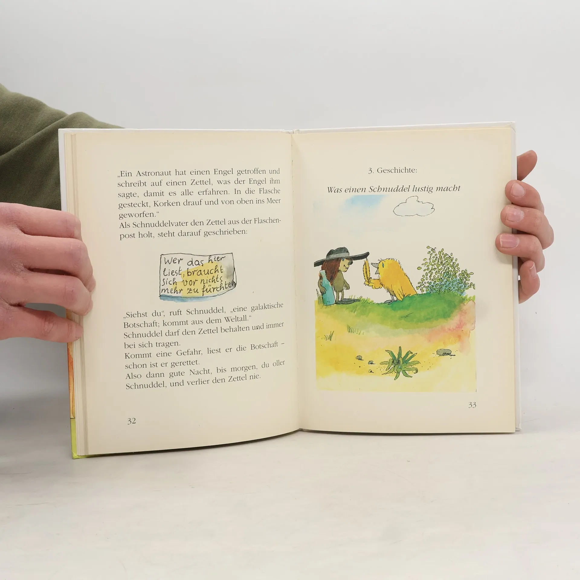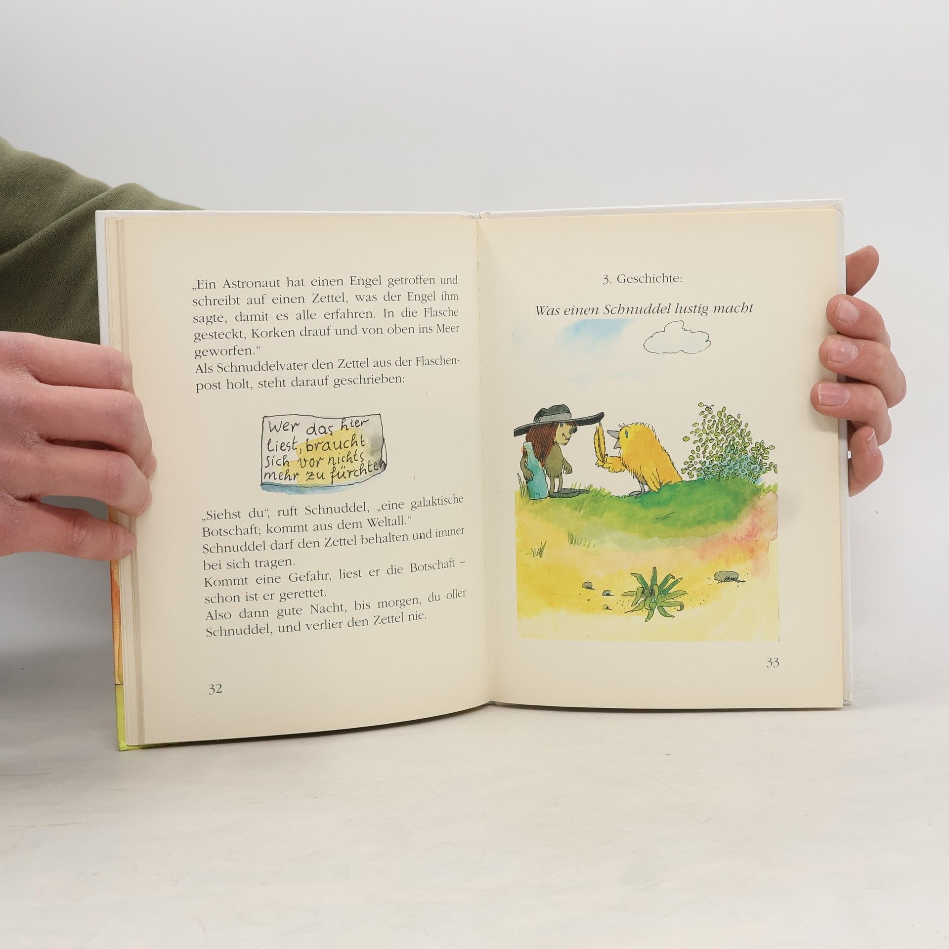 Schnuddel ist ein sehr kleiner Kerl. Aber er braucht sich vor nichts zu fürchten, weil er nämlich einen Hut hat, der ihn behütet und eine Botschaft, die ihm Kraft gibt. Obendrein bekommt er noch von seinem Freund Kanari eine Feder für seinen Hut. Das macht ihn lustig. Lustig sein und Kraft haben, etwas Besseres gibt es nicht auf der Welt, da kann man gut schlafen.