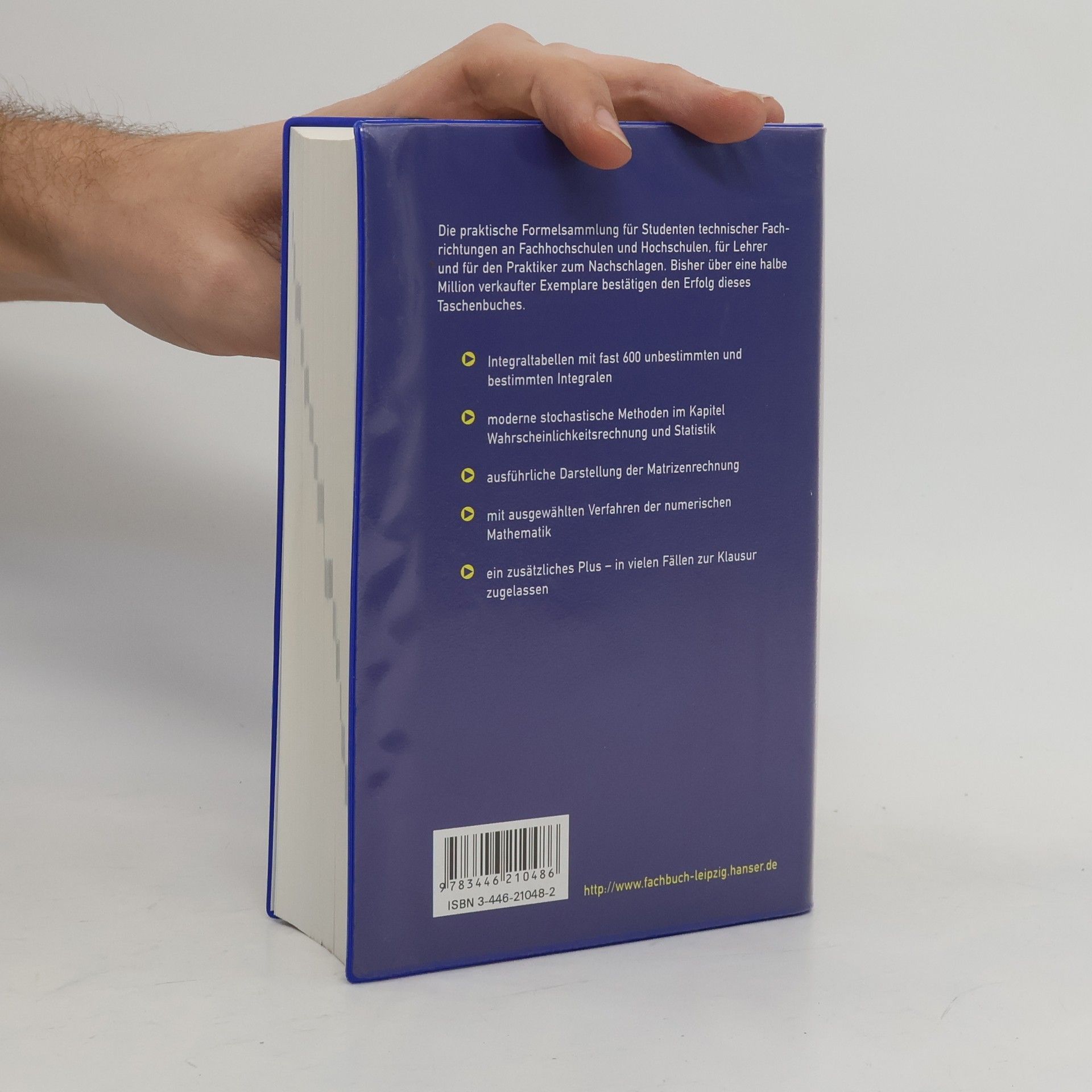 Die praktische Formelsammlung für Studenten technischer Fachrichtungen an Fachhochschulen und Hochschulen, für Lehrer und für den Praktiker zum Nachschlagen. Bisher über eine halbe Million verkaufter Exemplare bestätigen den Erfolg dieses Taschenbuches. Integraltabellen mit fast 600 unbestimmten und bestimmten Integralen moderne stochastische Methoden im Kapitel Wahrscheinlichkeitsrechnung und Statistik ausführliche Darstellung der Matrizenrechnung mit ausgewählten Verfahren der numerischen Mathematik ein zusätzliches Plus - in vielen Fällen zur Klausur zugelassen