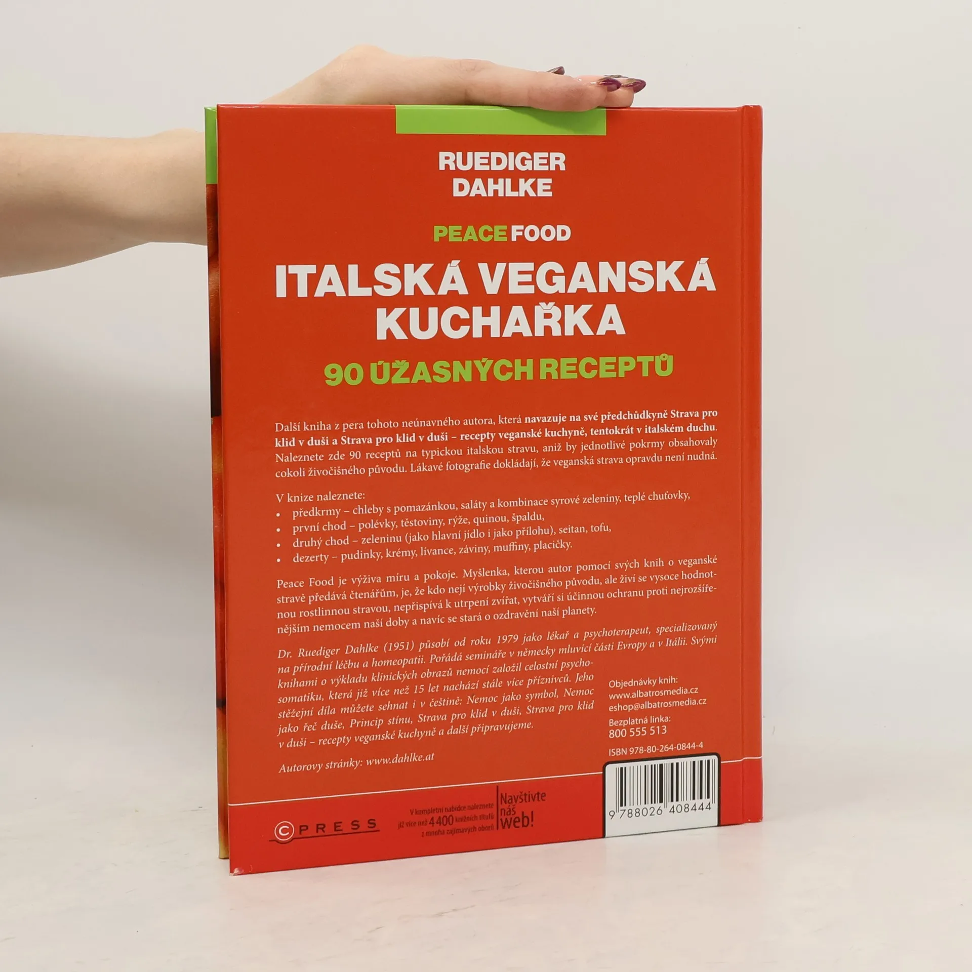 Další kniha tohoto neúnavného autora navazuje na předchozí tituly a tentokrát se zaměřuje na italskou veganskou kuchyni. Obsahuje 90 receptů na typická italská jídla bez živočišných produktů. Lákavé fotografie dokazují, že veganská strava může být rozmanitá a chutná. V knize najdete předkrmy jako chleby s pomazánkou a saláty, první chody zahrnující polévky, těstoviny a rýži, druhé chody s hlavními jídly z zeleniny, seitanu a tofu, a také dezerty jako pudinky, krémy a muffiny. Autor propaguje myšlenku, že veganská strava přispívá k míru a pokoji, a že konzumace rostlinné stravy pomáhá snižovat utrpení zvířat, chrání zdraví před běžnými nemocemi a přispívá k ozdravění planety. Dr. Ruediger Dahlke, lékař a psychoterapeut, se od roku 1979 specializuje na přírodní léčbu a homeopatii a organizuje semináře v německy mluvících zemích a v Itálii. Jeho díla o psychosomatice a klinických obrazech nemocí mají stále více příznivců. Mezi jeho významná díla patří také Nemoc jako symbol a Strava pro klid v duši.