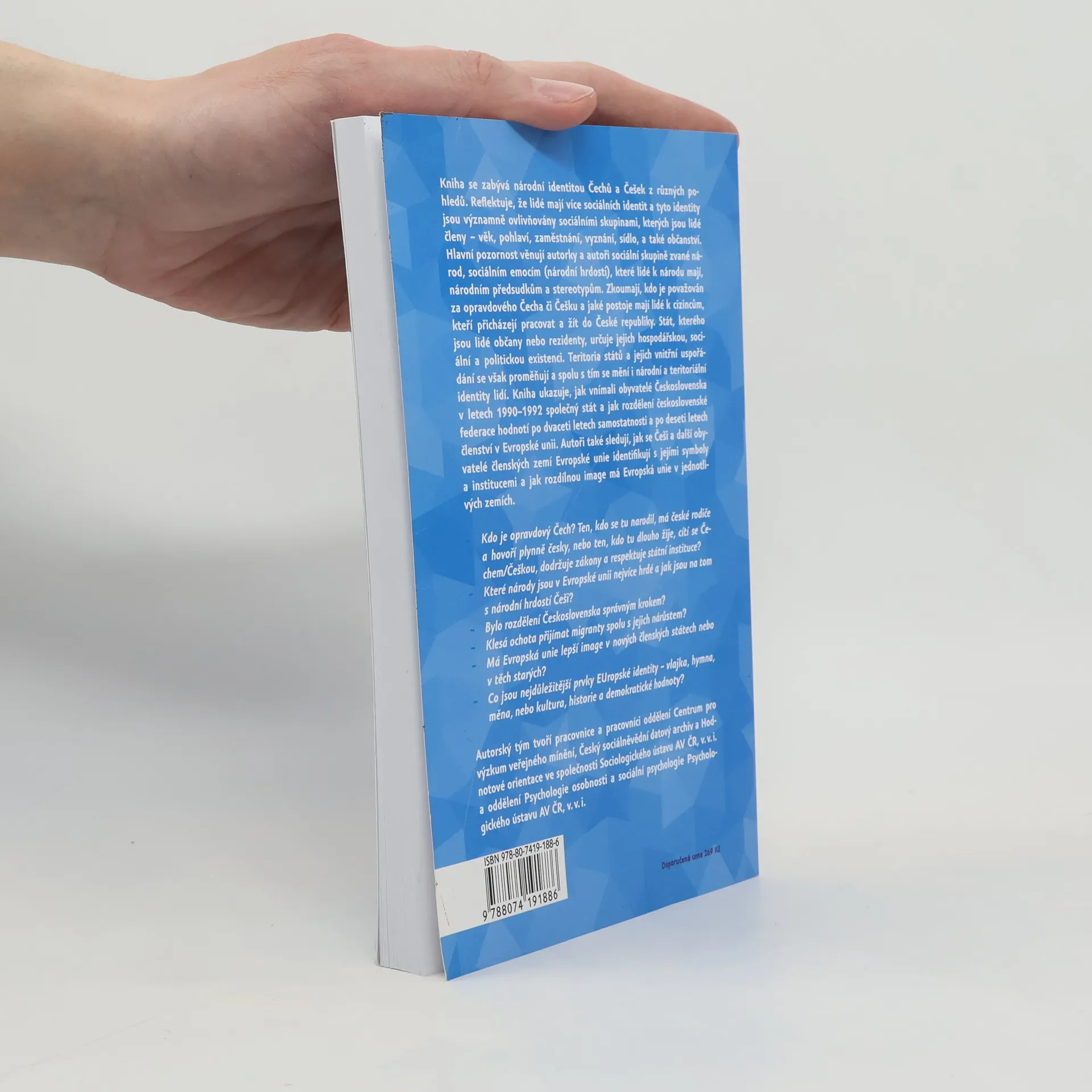 Kniha se zaměřuje na národní identitu Čechů a Češek z různých perspektiv. Lidé mají mnoho sociálních identit, závislých na skupinách, jichž jsou členy. Hlavní důraz je kladen na národ jako sociální skupinu, národní hrdost, předsudky a stereotypy. Autoři zkoumali, kdo je považován za pravého Čecha či Češku a jaké postoje mají lidé k cizincům, kteří přicházejí do České republiky. Občanství ovlivňuje hospodářskou, sociální a politickou existenci jednotlivců, přičemž se mění i národní a teritoriální identity. Kniha zkoumá, jak vnímali obyvatelé Československa v letech 1990–1992 společný stát a jak se identifikují lidé v 28 členských státech EU s touto nadnárodní entitou. Zajímá nás, zda je občanství v každodenním životě důležité, nebo zda hrají větší roli zaměstnání, rodinný stav a věk. Stereotyp Čecha s nízkou národní identifikací je negativní. Jak nás vidí sousední národy? Bylo rozdělení Československa správné? Kdo je opravdový Čech? Je to ten, kdo se narodil v Česku, nebo ten, kdo zde dlouho žije a ctí zákony? Jak se mění ochota přijímat migranty s jejich rostoucím počtem? Jaký je obraz EU v nových a starých členských státech? Jaké prvky evropské identity jsou nejdůležitější? A jak si Češi stojí v otázce národní hrdosti?