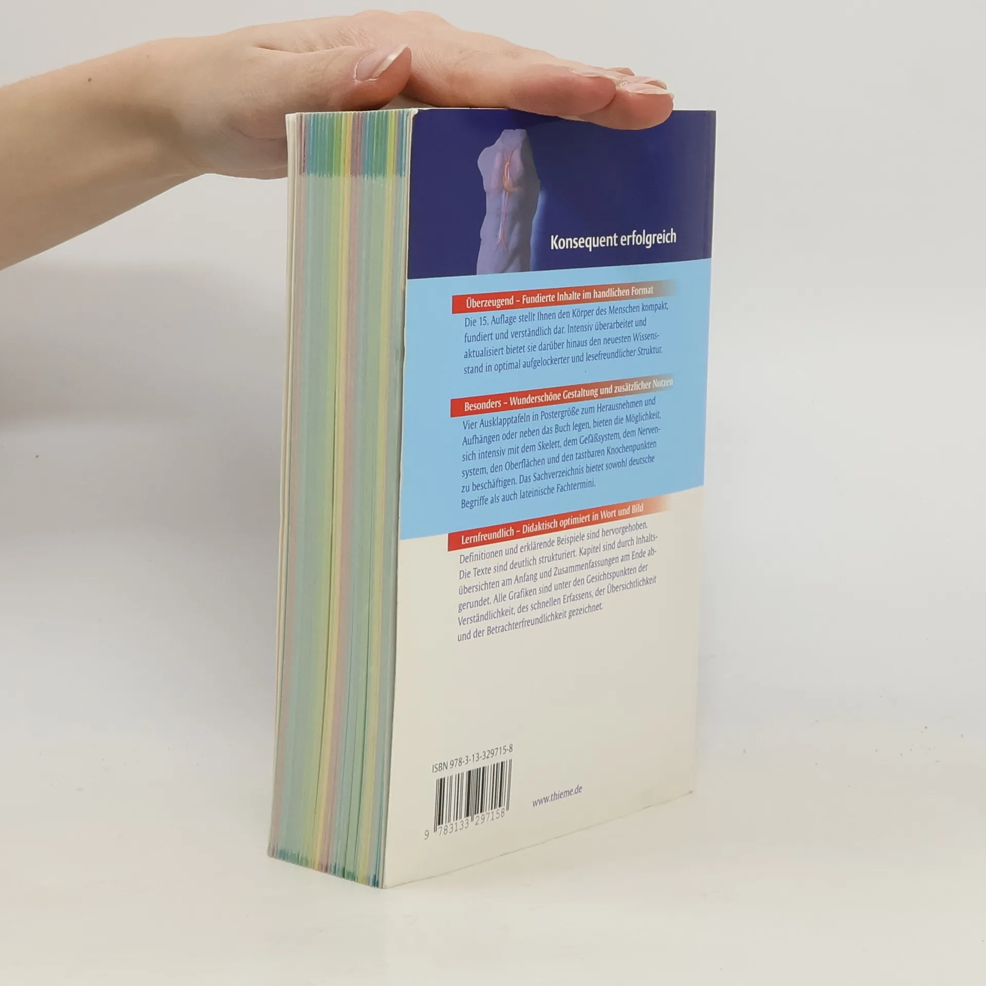 Fundierte Inhalte im handlichen Format Die 15. Auflage stellt den Körper des Menschen kompakt und verständlich dar. Intensiv überarbeitet und aktualisiert bietet sie darüber hinaus den neuesten Wissensstand in optimal aufgelockerter und lesefreundlicher Struktur. Grafiken im lernfreundlichen Posterformat Vier Ausklapptafeln in Postergröße zum Herausnehmen und Aufhängen oder neben das Buch legen, bieten die Möglichkeit, sich intensiv mit dem Skelett, dem Gefäßsystem, dem Nervensystem, den Oberflächen und den tastbaren Knochenpunkten zu beschäftigen. Das Sachverzeichnis bietet sowohl deutsche Begriffe als auch lateinische Fachtermini. Didaktisch optimiert in Wort und Bild Definitionen und erklärende Beispiele sind deutlich hervorgehoben. Die Texte sind leicht verständlich strukturiert. Kapitel sind durch Inhaltsübersichten am Anfang und Zusammenfassungen am Ende abgerundet. Alle Grafiken sind unter den Gesichtspunkten der Verständlichkeit, des schnellen Erfassens, der Übersichtlichkeit und der Betrachterfreundlichkeit gezeichnet.