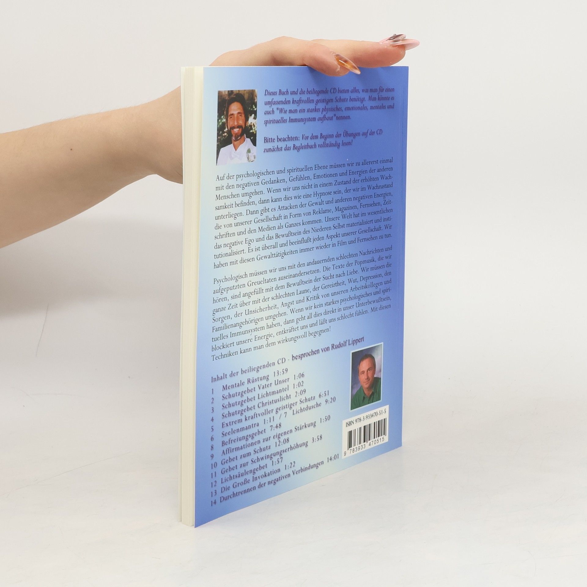 Dieses Buch und die beiliegende CD bieten alles, was man für einen umfassenden kraftvollen geistigen Schutz benötigt. Man könnte es auch "Wie man ein starkes physisches, emotionales, mentales und spirituelles Immunsystem aufbaut"nennen. Bitte beachten: Vor dem Beginn der Übungen auf der CD zunächst das Begleitbuch vollständig lesen! Inhalt der beiliegenden CD - besprochen von Rudolf Lippert 1 Mentale Rüstung 2 Schutzgebet Vater Unser 3 Schutzgebet Lichtmantel 4 Schutzgebet Christuslicht 5 Extrem kraftvoller geistiger Schutz 6 Seelenmantra 7 Lichtdusche 8 Befreiungsgebet 9 Affirmationen zur eigenen Stärkung 10 Gebet zum Schutz 11 Gebet zur Schwingungserhöhung 12 Lichtsäulengebet 13 Die Große Invokation 14 Durchtrennen der negativen Verbindungen 15 Deine eigene persönliche Kraft