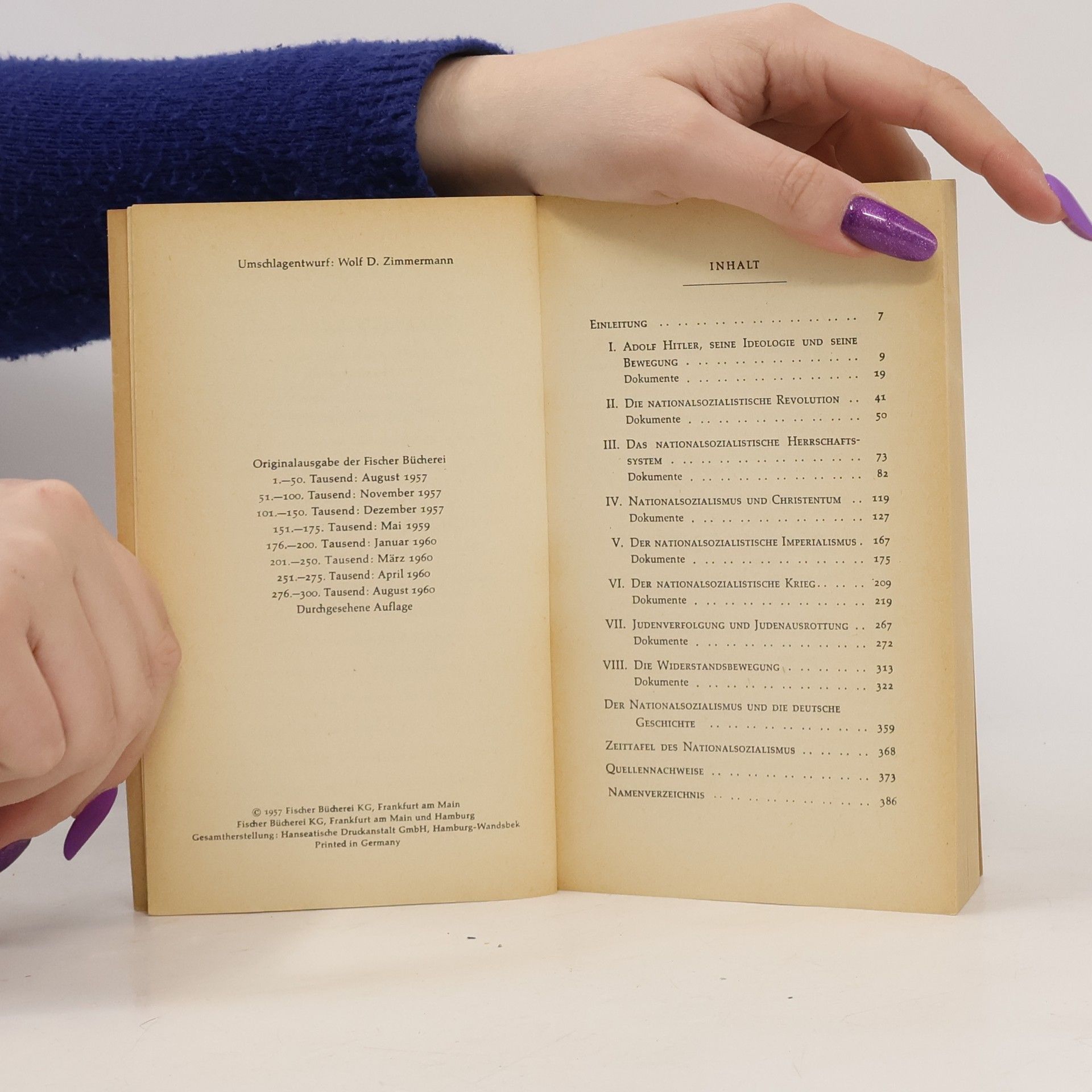 Die Erfahrung hat gelehrt, dass geschichtliche Ereignisse erst in gehörigem Abstand interpretiert und sachlich dargestellt werden können. Aus diesem Grunde unterlagen auch viele Publikationen über das Phänomen des Nationalsozialismus tendenziösen Einflüssen und begegneten dadurch zum Teil dem Widerstand der Leserschaft. Wir haben daher versucht, die politischen Ereignisse der jüngsten deutschen Vergangenheit selbst sprechen zu lassen. Die Dokumente, die Walther Hofer, Professor für Neuere Geschichte an der Universität Bern, zusammengestellt und kommentiert hat, sprechen eine beredte Sprache. Jeder Satz hat authentischen Aussagewert und steht für eine menschliche und politische Haltung, die als abschreckendes Exempel der Gegenwart vor Augen geführt werden muss. Wir hoffen, dass dieses Brevier der Unmenschlichkeit, das zugleich die Kräfte eines anderen, besseren Deutschland beschwört, seine Wirkung auf die Leser nicht verfehlen wird.