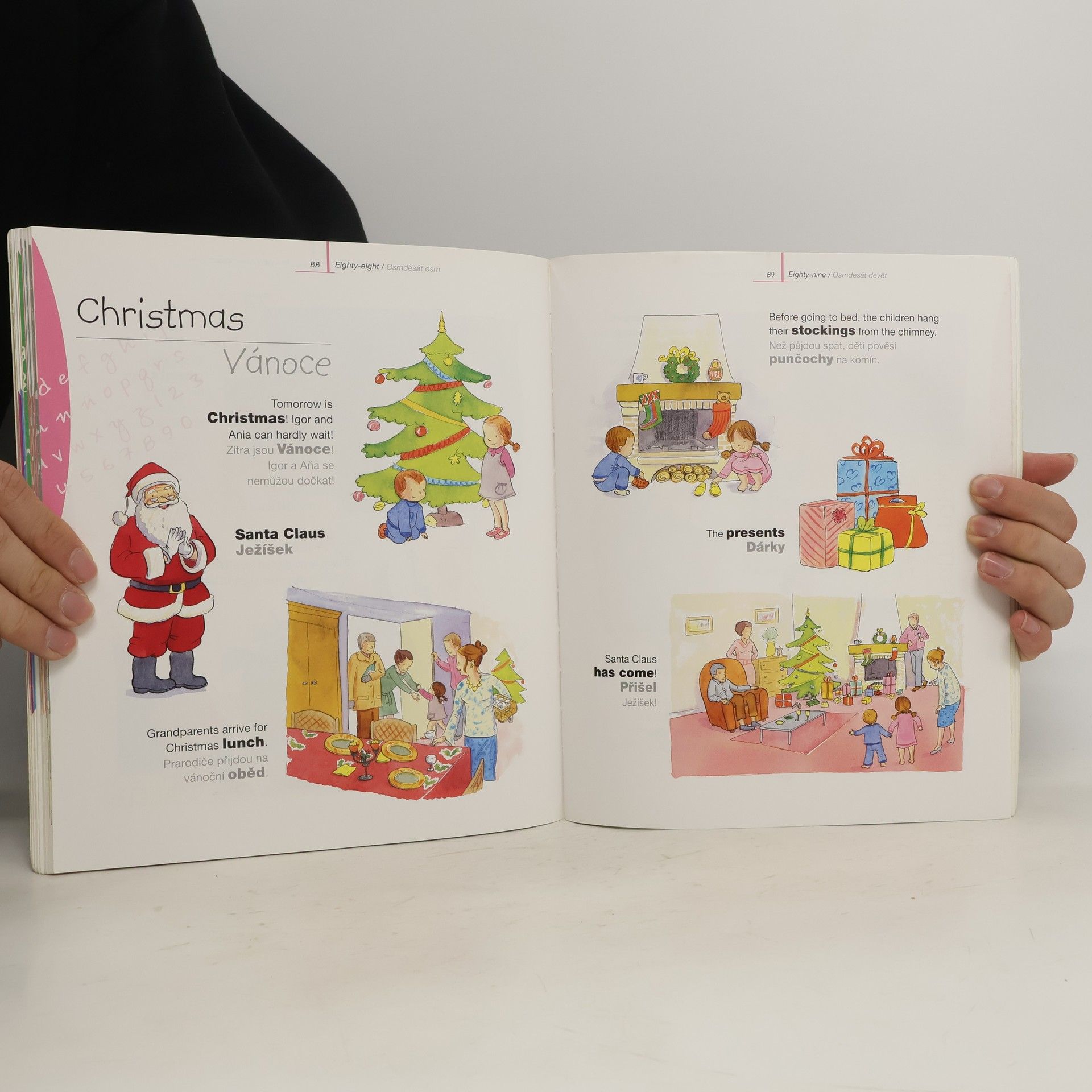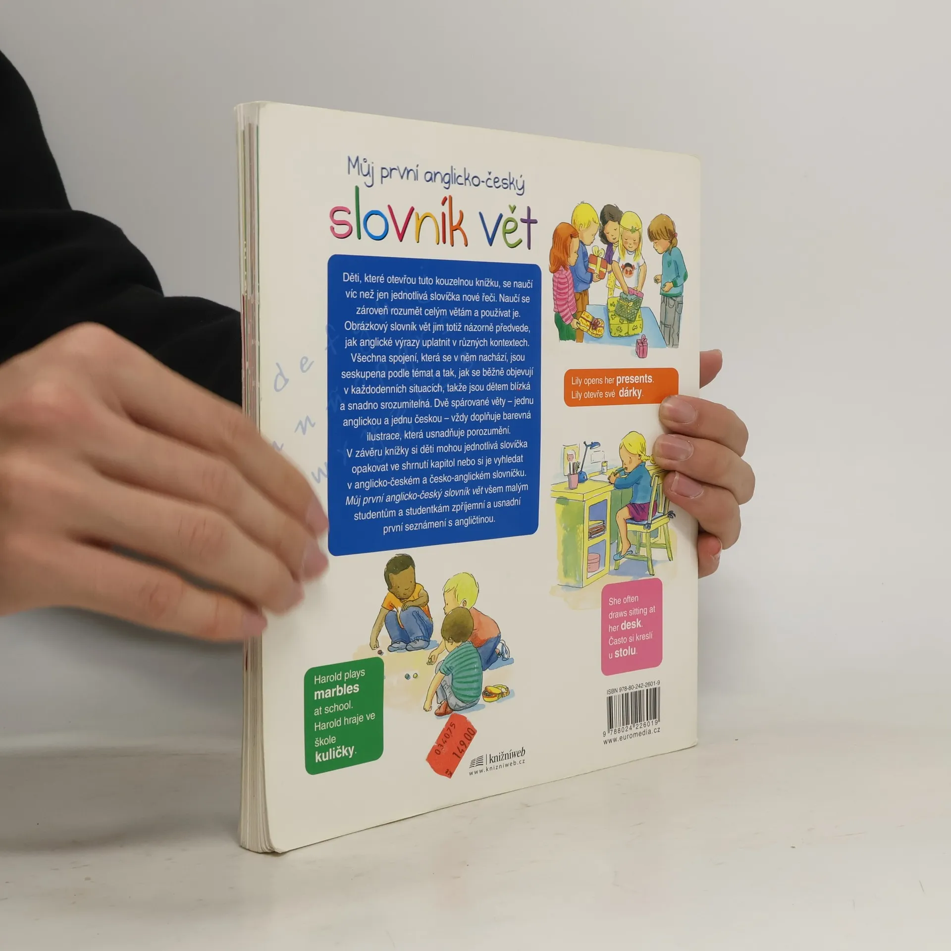 Děti, které otevřou tuto kouzelnou knížku, se naučí víc než jen jednotlivá slovíčka nové řeči. Naučí se zároveň rozumět celým větám a používat je. Tento slovník jim totiž názorně předvede, jak anglické výrazy uplatnit v různých kontextech. Všechna spojení, která jsou v něm uvedena, jsou seskupena podle témat a tak, jak se běžně objevují v každodenních situacích, takže jsou dětem blízká a snadno srozumitelná. Dvě spárované věty – jednu anglickou a jednu českou – vždy doplňuje barevná ilustrace, která usnadňuje porozumění. V závěru knížky si děti mohou jednotlivá slovíčka opakovat ve shrnutí kapitol nebo si je vyhledat v anglicko-českém a česko-anglickém slovníčku. Můj první anglicko-český slovník vět všem malým studentům a studentkám zpříjemní a usnadní první seznámení s angličtinou.