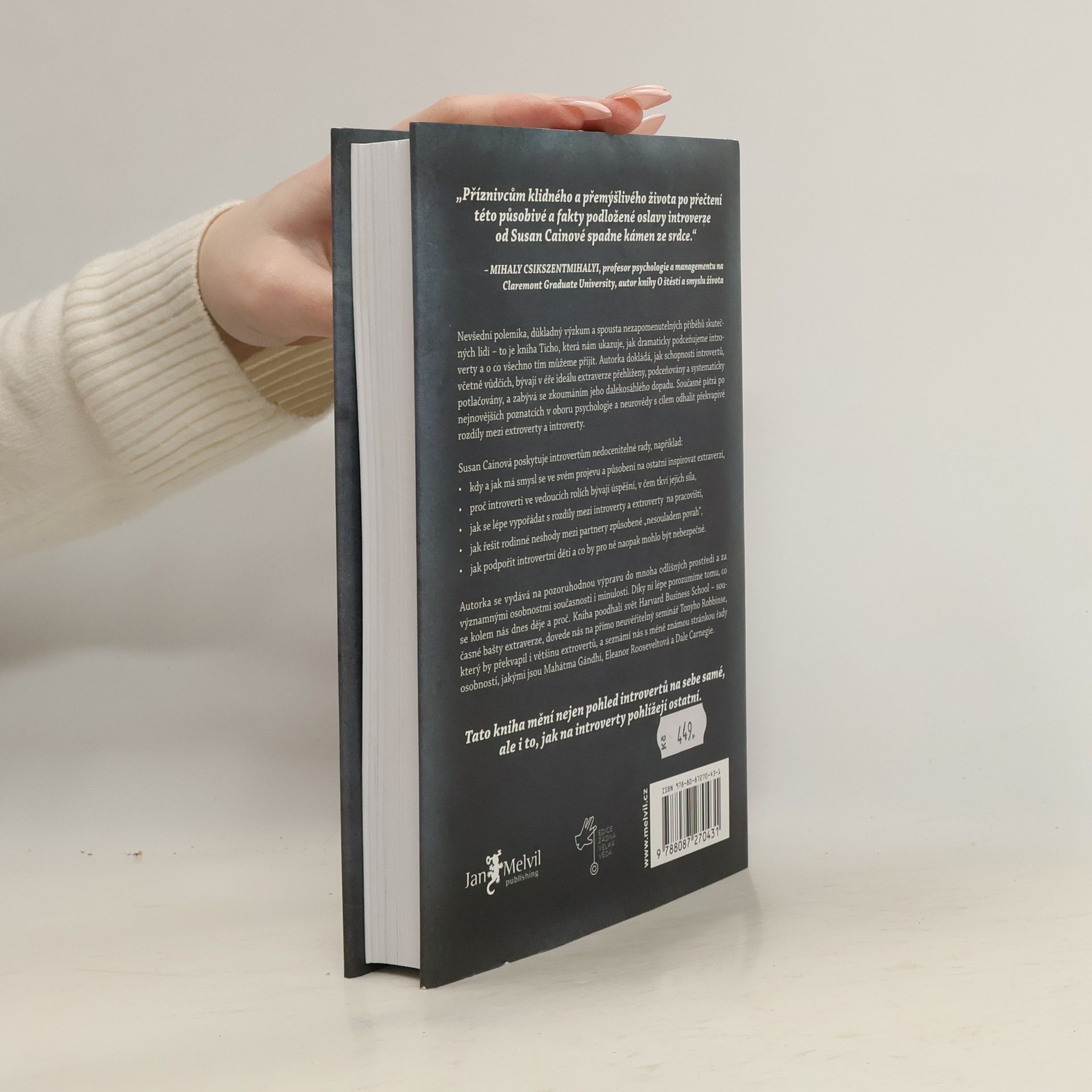 Kolik skutečných introvertů znáte? Odpověď vás možná překvapí. V kultuře, která nás od základní školy až po byznys vychovává k týmové práci, je vše nastavené pro úspěch extrovertů. Až díky této knize získali ti tiší svou mluvčí: Susan Cainovou. Její čtivý, důkladný a překvapivý text o tiché síle introvertů se stal velice rychle bestsellerem a autorka celebritou. Je to paradox, když sama o sobě prohlašuje, že je introvertem?