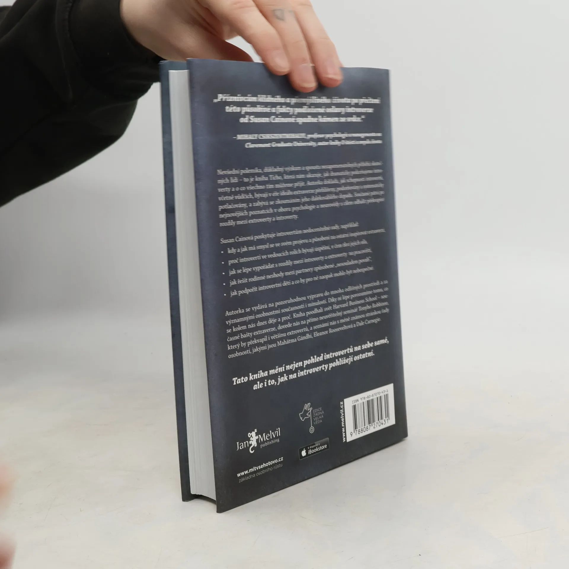Kolik skutečných introvertů znáte? Odpověď vás možná překvapí. V kultuře, která nás od základní školy až po byznys vychovává k týmové práci, je vše nastavené pro úspěch extrovertů. Až díky této knize získali ti tiší svou mluvčí: Susan Cainovou. Její čtivý, důkladný a překvapivý text o tiché síle introvertů se stal velice rychle bestsellerem a autorka celebritou. Je to paradox, když sama o sobě prohlašuje, že je introvertem?