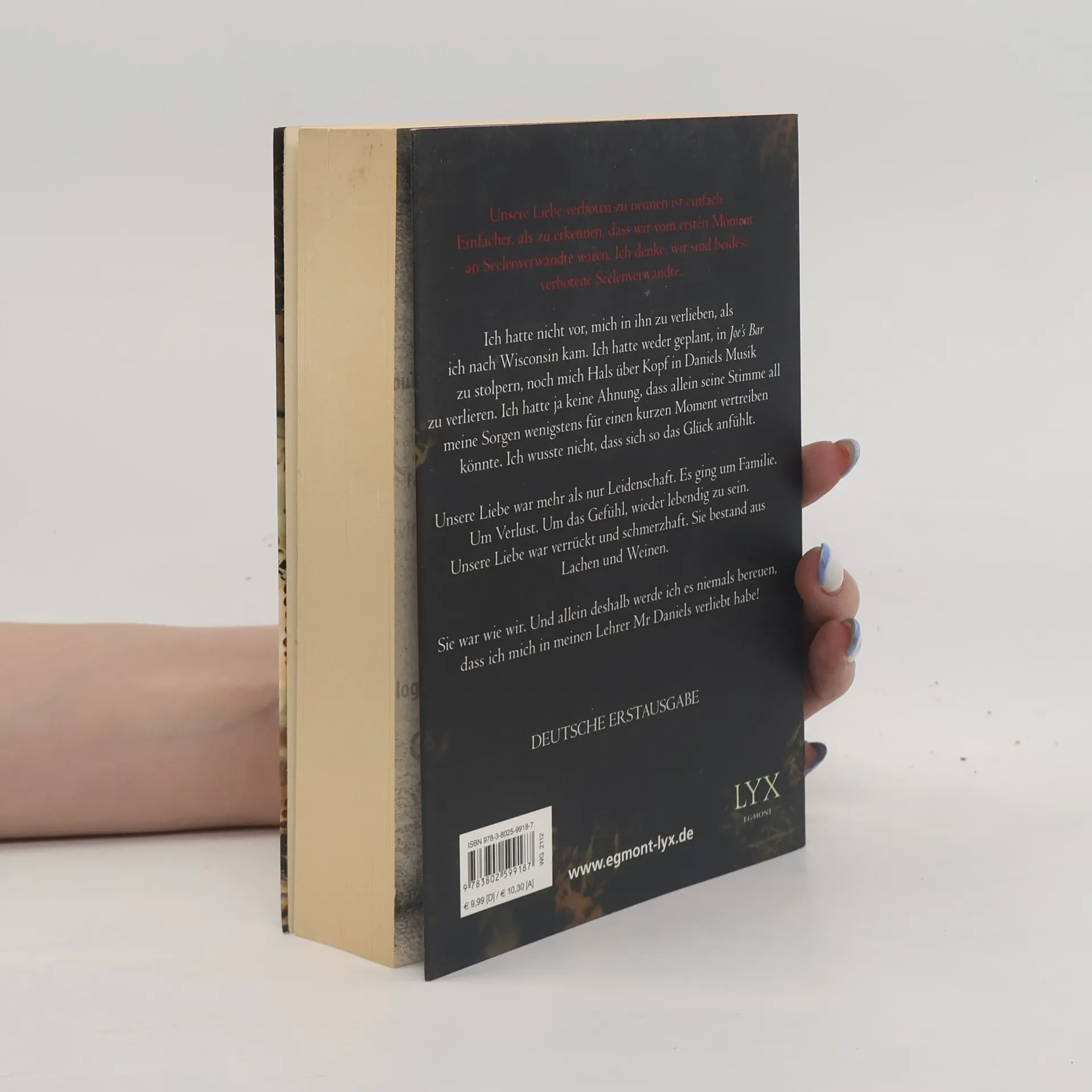 Unsere Liebe verboten zu nennen ist einfach. Einfacher, als zu erkennen, dass wir vom ersten Moment an Seelenverwandte waren. Ich denke, wir sind beides: verbotene Seelenverwandte. Ich hatte nicht vor, mich in ihn zu verlieben, als ich nach Wisconsin kam. Ich hatte weder geplant, in Joes Bar zu stolpern, noch mich Hals über Kopf in Daniels Musik zu verlieren. Ich hatte ja keine Ahnung, dass allein seine Stimme all meine Sorgen wenigstens für einen kurzen Moment vertreiben könnte. Ich wusste nicht, dass sich so das Glück anfühlt. Unsere Liebe war mehr als nur Leidenschaft. Es ging um Familie. Um Verlust. Um das Gefühl, wieder lebendig zu sein. Unsere Liebe war verrückt und schmerzhaft. Sie bestand aus Lachen und Weinen. Sie war wie wir. Und allein deshalb werde ich es niemals bereuen, dass ich mich in meinen Lehrer Mr Daniels verliebt habe!