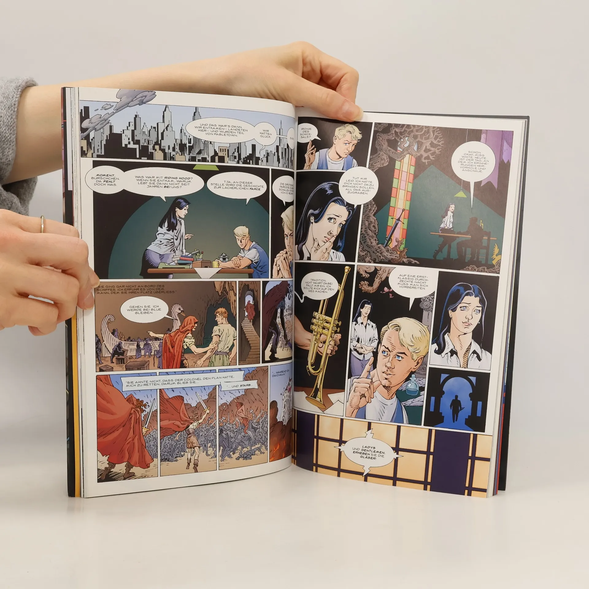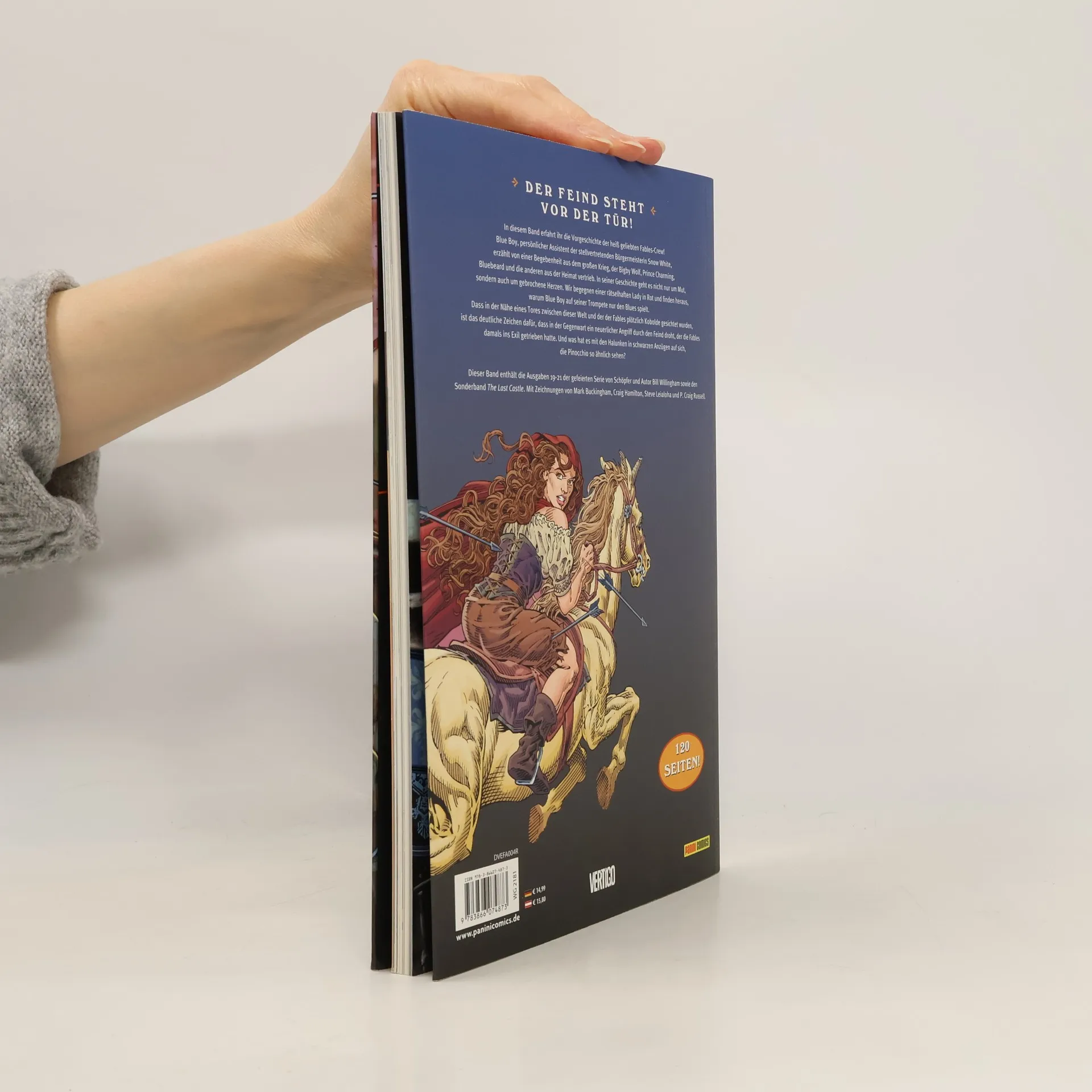 Der Feind steht vor der Tür! In diesem Band erfahrt ihr die Vorgeschichte der heiß geliebten Fables Crew! Blue Boy, persönlicher Assistent der stellvertretenden Bürgermeisterin Snow White, erzählt von einer Begebenheit aus dem großen Krieg, der Bigby Wolf, Prince Carming, Bluebeard und die Anderen aus der Heimat vertrieb. In seiner Geschichte geht es nicht nur um Mut, sondern auch um geborchene Herzen. Wir begegnen einer rätselhaften Lady in Rot und finden heraus, warum Blue Boy auf seiner Trompete nur den Blues spielt. Dass in der Nähe eines Tores zwischen dieser Welt und der der Fables plötzlich Kobolde gesichtet wurden, ist das deutliche Zeichen dafür, dass in der Gegenwart ein neuerlicher Angriff durch den Feind droht, der die Fables damals ins Exil getrieben hatte. Und was hat es mit den Halunken in schwarzen Anzügen auf sich, die Pinocchio so ähnlich sehen?