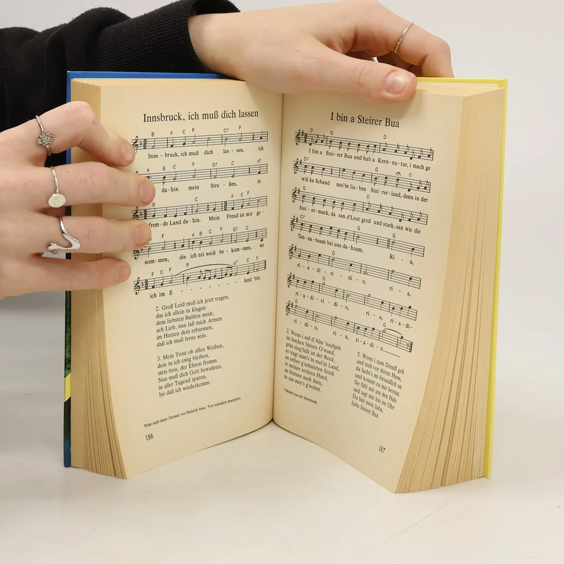 Umfangreiche Sammlung der bekanntesten und beliebtesten deutschen Volkslieder, aufgezeichnet in einstimmig notierten Melodien mit Akkordsymbolen.
