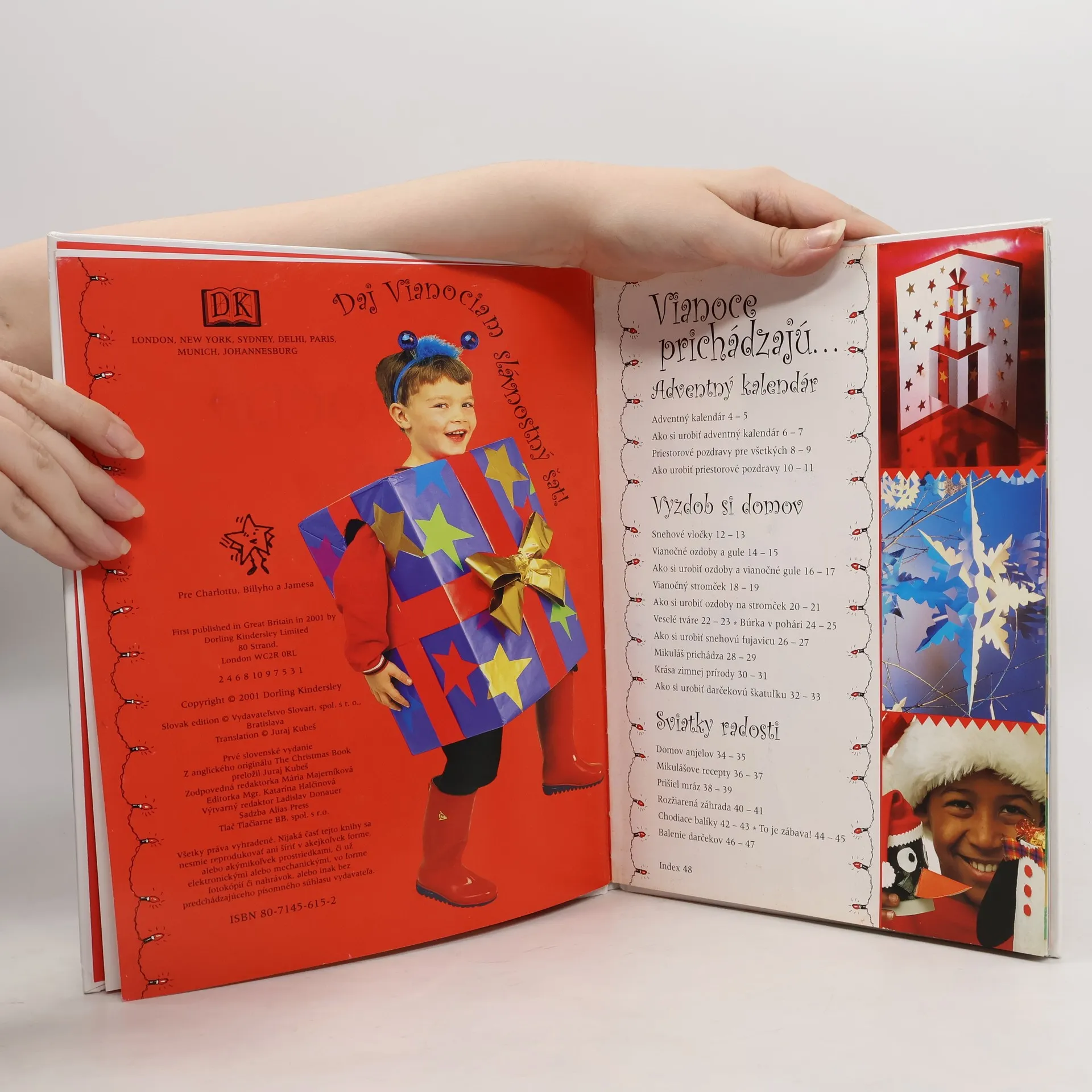 Jednoduché a zábavné návody na veselé Vianoce, Vyzdob si byt farebnými vianočnými ozdobami a záplavou snehových vločiek, Vyrob si vianočnú fujavicu, Urob si vlastnú bonboniéru, Privítaj Vianoce s vlastnoručne vyrobeným adventným kalendárom. Kapitoly: Adventný kalendár-Ako si urobiť adventný kalendár, Priestorové pozdravy pre všetkých, Ako urobiť priestorové pozdravy. Vyzdob si domov-Snehové vločky, Vianočné ozdoby a gule, Ako si urobiť ozdoby a vianočné gule, Vianočný stromček, Ako si urobiť ozdoby na stromček, Veselé tváre, Búrka v pohári, Ako si urobiť snehovú fujavicu, Mikuláš prichádza, Krása zimnej prírody, Ako si urobiť darčekovú škatuľku. Sviatky radosti-Domov anjelov, Mikulášove recepty, Prišiel mráz, Rozžiarená záhrada, Chodiace balíky, Balenie darčekov.