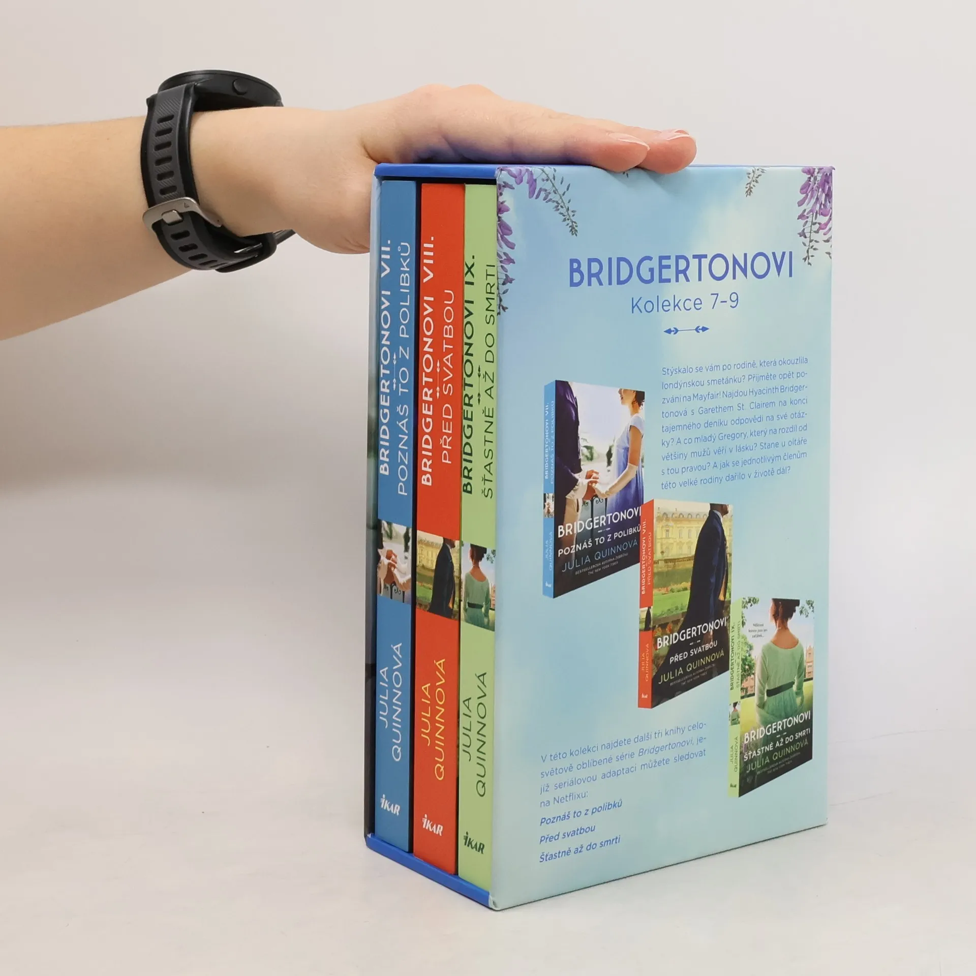Vraťte se díky tomuto boxu k charismatické rodině, která okouzlila londýnskou smetánku! Najdou Hyacinth Bridgertonová s Garethem St. Clairem na konci tajemného deníku odpovědi na své otázky? A co mladý pán Gregory Bridgerton, který na rozdíl od většiny mužů věří v lásku? Podaří se takéjemu naplnit svá očekávání a stane nakonec u oltáře s tou pravou? A pokud by vás zajímalo, jak se jednotlivým členům této velké rodiny dařilo dál, je tu pro vás závěrečný díl série plný epilogů. Tak neváhejte, Mayfair už čeká!